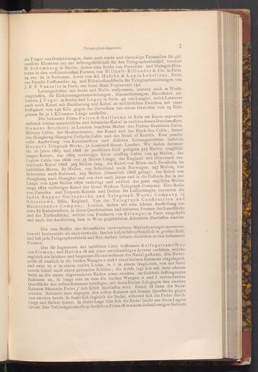Die bekannte Firma Felten& Guillaume in Köln am Rhein exponirte 10 Stück fchöne unterirdifche und fubmarine Kabel in verfchiedenen Durchmeffern. Siemens Brothers in London brachten Mufter des Platino- Brazileira Cable, Military Cable, des Mediterranean, des Brazil und des Black- Sea Cable, ferner des Hongkong- Shanghai- Poffie da- Cable und des Strait of Kertfch. Eine prachtvolle Ausftellung von Kabelmuftern und ifolirten Leitungsdrähten lieferten Hooper's Telegraph Works, 31 Lombard Street, London. Wir finden darunter die im Jahre 1863 und 1868 im perfifchen Golf gelegten 525 Meilen( englifch) langen Kabels, das 1865 verfertigte River croffing Cable von 45 Meilen, das Ceylon Cable von 1866 von 35 Meilen Länge, das England und Dänemark verbindende Kabel 1868, 365 Meilen lang, die Kabel von Möen nach Bornholm im baltifchen Meere, 82 Meilen, von Schottland nach Norwegen, 247 Meilen, von Schweden nach Rufsland, 103 Meilen( fämmtlich 1868 gelegt), das Kabel von Hongkong nach Shanghai und von dort nach Japan und in die Poffieda Bai in der Länge von 2300 Meilen 1870 verfertigt und endlich das 5000 englifche Meilen lange 1872 verfertigte Kabel der Great Weftern Telegraph Company. Eine Reihe von Unterfee- und Torpedo- Kabeln und Drähte für Luftleitungen exponirte die India Rupper Guttapercha and Telegraph Works Company in Silvertown, Effex, England. Von der Telegraph Conftruction and Maintenance Company, London, finden wir eine fchöne Ausftellung von etwa 82 Kabelmuftern, in ihren Querfchnitten und äufseren Formen der Landftücke und der Tieffeeftücke, welche von Freiherrn von Erlanger in Paris ausgeftellt und nach der Ausftellung dem in Wien gegründeten Athenäum überlaffen wurden.