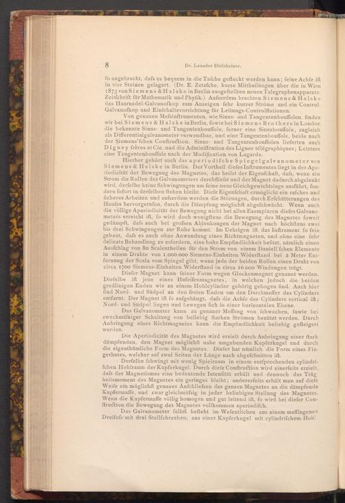 Hierher gehört auch das a periodifche Spiegelgalvanometer von Siemens& Halske in Berlin. Der Vortheil diefes Inftrumentes liegt in der Aperiodicität der Bewegung des Magnetes, das heifst der Eigenfchaft, dafs, wenn ein Strom die Rollen des Galvanometers durchfliefst und der Magnet dadurch abgelenkt wird, derfelbe keine Schwingungen um feine neue Gleichgewichtslage ausführt, fondern fofort in derfelben ftehen bleibt. Diefe Eigenfchaft ermöglicht ein rafches und ficheres Arbeiten und aufserdem werden die Störungen, durch Erfchütterungen des Haufes hervorgerufen, durch die Dämpfung möglichft abgefchwächt. Wenn auch die völlige Aperiodicität der Bewegung nicht bei allen Exemplaren diefes Galvanometers erreicht ift, fo wird doch wenigftens die Bewegung des Magnetes foweit gedämpft, dafs auch bei grofsen Ablenkungen der Magnet nach höchftens zwei bis drei Schwingungen zur Ruhe kommt. Im Uebrigen ist das Inftrument fo fein gebaut, dafs es auch ohne Anwendung eines Richtmagneten, und ohne eine fehr delicate Behandlung zu erfordern, eine hohe Empfindlichkeit befitzt, nämlich einen Ausfchlag von 80 Scalentheilen für den Strom von einem Daniell'fchen Elemente in einem Drahte von 1,000.000 Siemens- Einheiten Widerftand bei 2 Meter Entfernung der Scala vom Spiegel gibt, wenn jede der beiden Rollen einen Draht von circa 1700 Siemens- Einheiten Widerftand in circa 16.000 Windungen trägt.