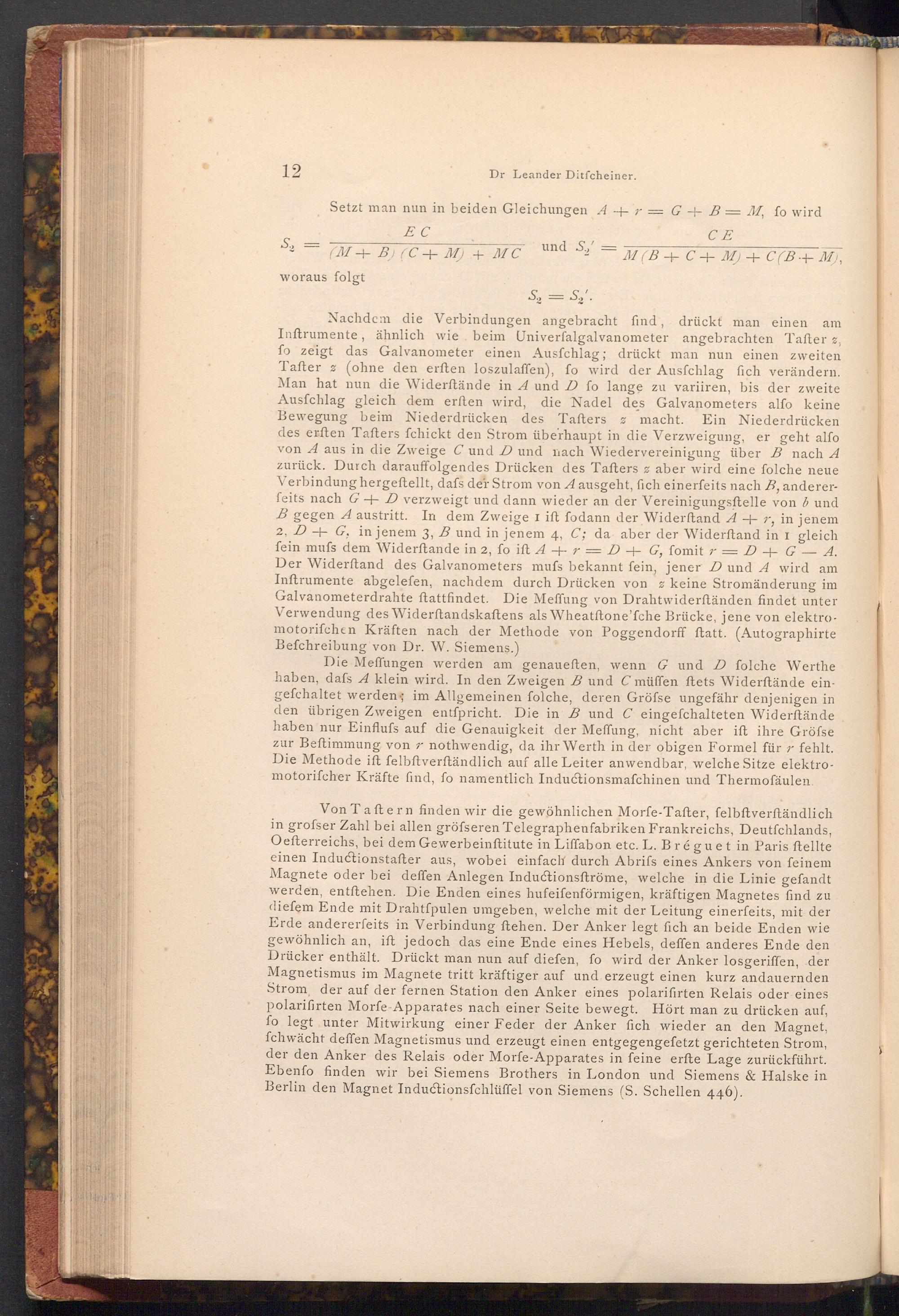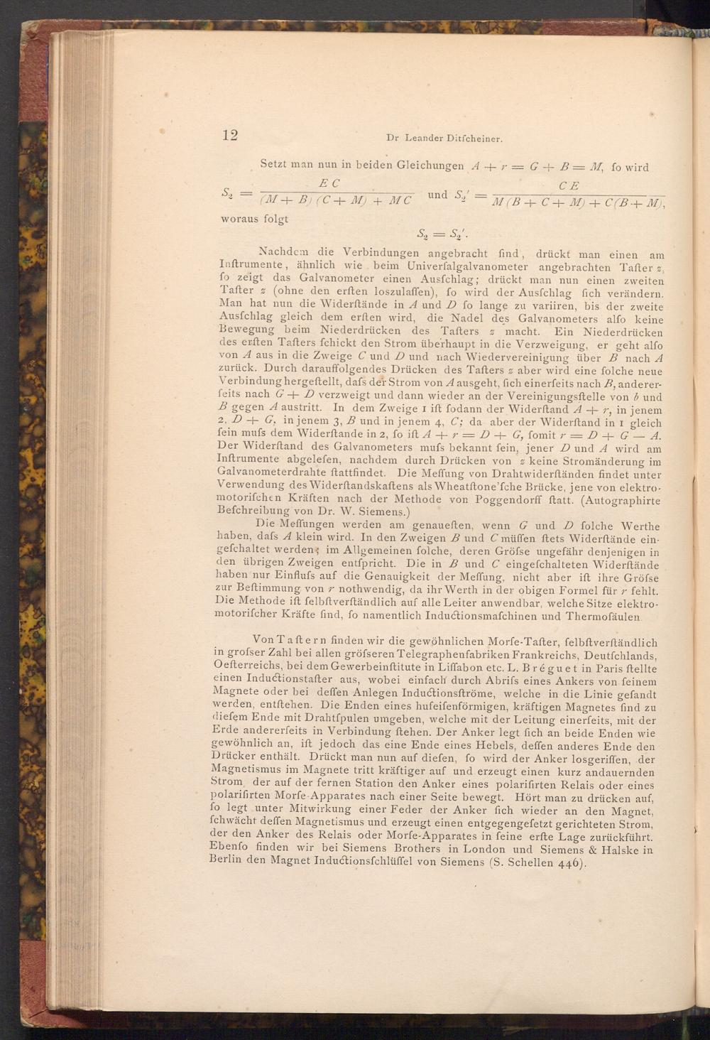 Nachdem die Verbindungen angebracht find, drückt man einen am Inftrumente, ähnlich wie beim Univerfalgalvanometer angebrachten Tafter%, fo zeigt das Galvanometer einen Ausfchlag; drückt man nun einen zweiten Tafter( ohne den erften loszulaffen), fo wird der Ausfchlag fich verändern. Man hat nun die Widerftände in A und D fo lange zu variiren, bis der zweite Ausfchlag gleich dem erften wird, die Nadel des Galvanometers alfo keine Bewegung beim Niederdrücken des Tafters. z macht. Ein Niederdrücken des erften Tafters fchickt den Strom überhaupt in die Verzweigung, er geht alfo von A aus in die Zweige C und D und nach Wiedervereinigung über B nach A zurück. Durch darauffolgendes Drücken des Tafters z aber wird eine folche neue Verbindung hergestellt, dafs der Strom von A ausgeht, fich einerfeits nach B, andererfeits nach G+ D verzweigt und dann wieder an der Vereinigungsftelle von b und B gegen A austritt. In dem Zweige I ift fodann der Widerftand A+ r, in jenem 2, DG, in jenem 3, B und in jenem 4, C; da aber der Widerftand in I gleich fein mufs dem Widerftande in 2, fo ift A+ r= D+ G, fomit r= D+ G- A. Der Widerftand des Galvanometers mufs bekannt fein, jener D und A wird am Inftrumente abgelefen, nachdem durch Drücken von keine Stromänderung im Galvanometerdrahte ftattfindet. Die Meffung von Drahtwiderftänden findet unter Verwendung des Widerftandskaftens als Wheatftone'fche Brücke, jene von elektromotorifchen Kräften nach der Methode von Poggendorff ftatt.( Autographirte Befchreibung von Dr. W. Siemens.)