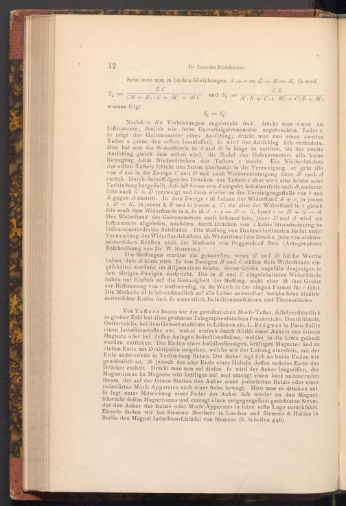 Die Meffungen werden am genaueften, wenn G und D folche Werthe haben, dafs A klein wird. In den Zweigen B und C müffen ftets Widerftände eingefchaltet werden; im Allgemeinen folche, deren Gröfse ungefähr denjenigen in den übrigen Zweigen entſpricht. Die in B und C eingefchalteten Widerstände haben nur Einfluss auf die Genauigkeit der Meffung, nicht aber ift ihre Gröfse zur Beftimmung von nothwendig, da ihr Werth in der obigen Formel für fehlt. Die Methode ift felbftverſtändlich auf alle Leiter anwendbar, welche Sitze elektromotorifcher Kräfte find, fo namentlich Inductionsmafchinen und Thermofäulen.