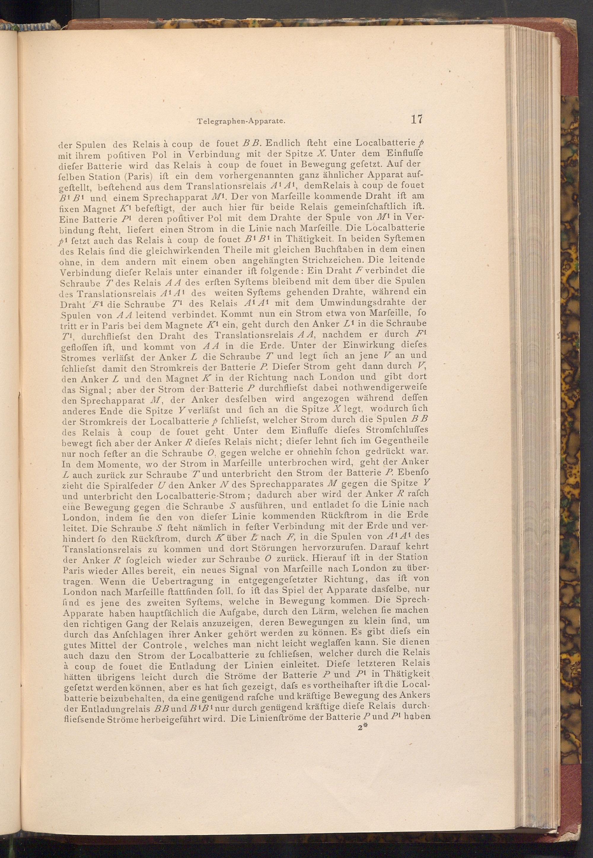 der Spulen des Relais à coup de fouet BB. Endlich fteht eine Localbatterie p mit ihrem pofitiven Pol in Verbindung mit der Spitze X. Unter dem Einfluffe diefer Batterie wird das Relais à coup de fouet in Bewegung gefetzt. Auf der felben Station( Paris) ift ein dem vorhergenannten ganz ähnlicher Apparat aufgeftellt, beftehend aus dem Translationsrelais A1 A1, demRelais à coup de fouet B1 B1 und einem Sprechapparat M1. Der von Marfeille kommende Draht ift am fixen Magnet K1 befeftigt, der auch hier für beide Relais gemeinfchaftlich ift. Eine Batterie Pi deren pofitiver Pol mit dem Drahte der Spule von M1 in Verbindung fteht, liefert einen Strom in die Linie nach Marfeille. Die Localbatterie p1 fetzt auch das Relais à coup de fouet B1 B1 in Thätigkeit. In beiden Syftemen des Relais find die gleichwirkenden Theile mit gleichen Buchstaben in dem einen ohne, in dem andern mit einem oben angehängten Strichzeichen. Die leitende Verbindung diefer Relais unter einander ift folgende: Ein Draht F verbindet die Schraube 7 des Relais AA des erften Syftems bleibend mit dem über die Spulen des Translationsrelais A1 A1 des weiten Syftems gehenden Drahte, während ein Draht F1 die Schraube 7" des Relais A1 A1 mit dem Umwindungsdrahte der Spulen von AA leitend verbindet. Kommt nun ein Strom etwa von Marſeille, fo tritt er in Paris bei dem Magnete K1 ein, geht durch den Anker Z1 in die Schraube T1, durchfliefst den Draht des Translationsrelais A A, nachdem er durch F1 gefloffen ift, und kommt von AA in die Erde. Unter der Einwirkung diefes Stromes verläfst der Anker L die Schraube T und legt sich an jene V an und fchliefst damit den Stromkreis der Batterie P. Diefer Strom geht dann durch V, den Anker Z und den Magnet K in der Richtung nach London und gibt dort das Signal; aber der Strom der Batterie P durchfliefst dabei nothwendigerweife den Sprechapparat M, der Anker desfelben wird angezogen während deffen anderes Ende die Spitze Y verläfst und fich an die Spitze X legt, wodurch fich der Stromkreis der Localbatterie> fchliefst, welcher Strom durch die Spulen B B des Relais à coup de fouet geht. Unter dem Einfluffe diefes Stromfchluffes bewegt fich aber der Anker R diefes Relais nicht; diefer lehnt fich im Gegentheile nur noch fefter an die Schraube O, gegen welche er ohnehin fchon gedrückt war. In dem Momente, wo der Strom in Marfeille unterbrochen wird, geht der Anker Lauch zurück zur Schraube Tund unterbricht den Strom der Batterie P. Ebenfo zieht die Spiralfeder U den Anker N des Sprechapparates M gegen die Spitze Y und unterbricht den Localbatterie- Strom; dadurch aber wird der Anker R rafch eine Bewegung gegen die Schraube S ausführen, und entladet fo die Linie nach London, indem fie den von diefer Linie kommenden Rückftrom in die Erde leitet. Die Schraube S fteht nämlich in fefter Verbindung mit der Erde und verhindert fo den Rückftrom, durch Küber E nach F, in die Spulen von A1 A1 des Translationsrelais zu kommen und dort Störungen hervorzurufen. Darauf kehrt der Anker R fogleich wieder zur Schraube O zurück. Hierauf ift in der Station Paris wieder Alles bereit, ein neues Signal von Marfeille nach London zu übertragen. Wenn die Uebertragung in entgegengefetzter Richtung, das ist von London nach Marfeille ftattfinden foll, fo ift das Spiel der Apparate dasfelbe, nur find es jene des zweiten Syftems, welche in Bewegung kommen. Die SprechApparate haben hauptfächlich die Aufgabe, durch den Lärm, welchen fie machen den richtigen Gang der Relais anzuzeigen, deren Bewegungen zu klein find, um durch das Anfchlagen ihrer Anker gehört werden zu können. Es gibt diefs ein gutes Mittel der Controle, welches man nicht leicht weglaffen kann. Sie dienen auch dazu den Strom der Localbatterie zu fchliefsen, welcher durch die Relais à coup de fouet die Entladung der Linien einleitet. Diefe letzteren Relais hätten übrigens leicht durch die Ströme der Batterie P und P¹ in Thätigkeit gefetzt werden können, aber es hat fich gezeigt, dafs es vortheihafter ift die Localbatterie beizubehalten, da eine genügend rafche und kräftige Bewegung des Ankers der Entladungrelais BB und B1B1 nur durch genügend kräftige diefe Relais durch. fliefsende Ströme herbeigeführt wird. Die Linienftröme der Batterie P und P' haben