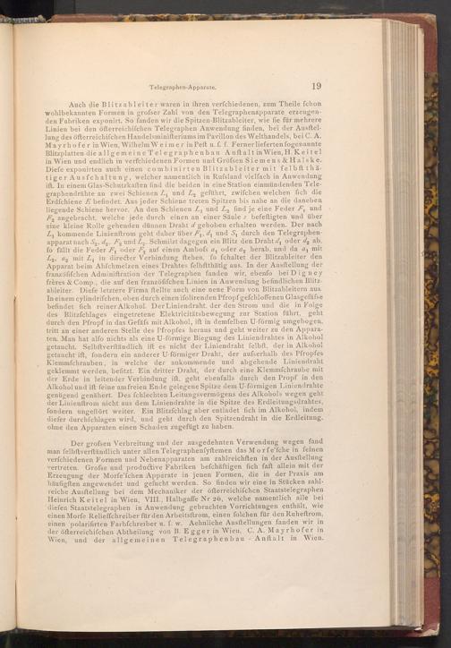 Der grofsen Verbreitung und der ausgedehnten Verwendung wegen fand man felbftverſtändlich unter allen Telegraphenfyftemen das Morfe'fche in feinen verfchiedenen Formen und Nebenapparaten am zahlreichften in der Ausstellung vertreten. Grofse und productive Fabriken befchäftigen fich faft allein mit der Erzeugung der Morfe'fchen Apparate in jenen Formen, die in der Praxis am häufigften angewendet und gefucht werden. So finden wir eine in Stücken zahlreiche Ausftellung bei dem Mechaniker der öfterreichifchen Staatstelegraphen Heinrich Keitel in Wien, VIII., Halbgaffe Nr 26, welche namentlich alle bei diefen Staatstelegraphen in Anwendung gebrachten Vorrichtungen enthält, wie einen Morfe Relieffchreiber für den Arbeitsftrom, einen folchen für den Ruheftrom, einen polarifirten Farbfchreiber u. f. w. Aehnliche Ausftellungen fanden wir in der öfterreichifchen Abtheilung von B. Egger in Wien, C. A. Mayrhofer in Wien, und der allgemeinen Telegraphenbau Anft alt in Wien.