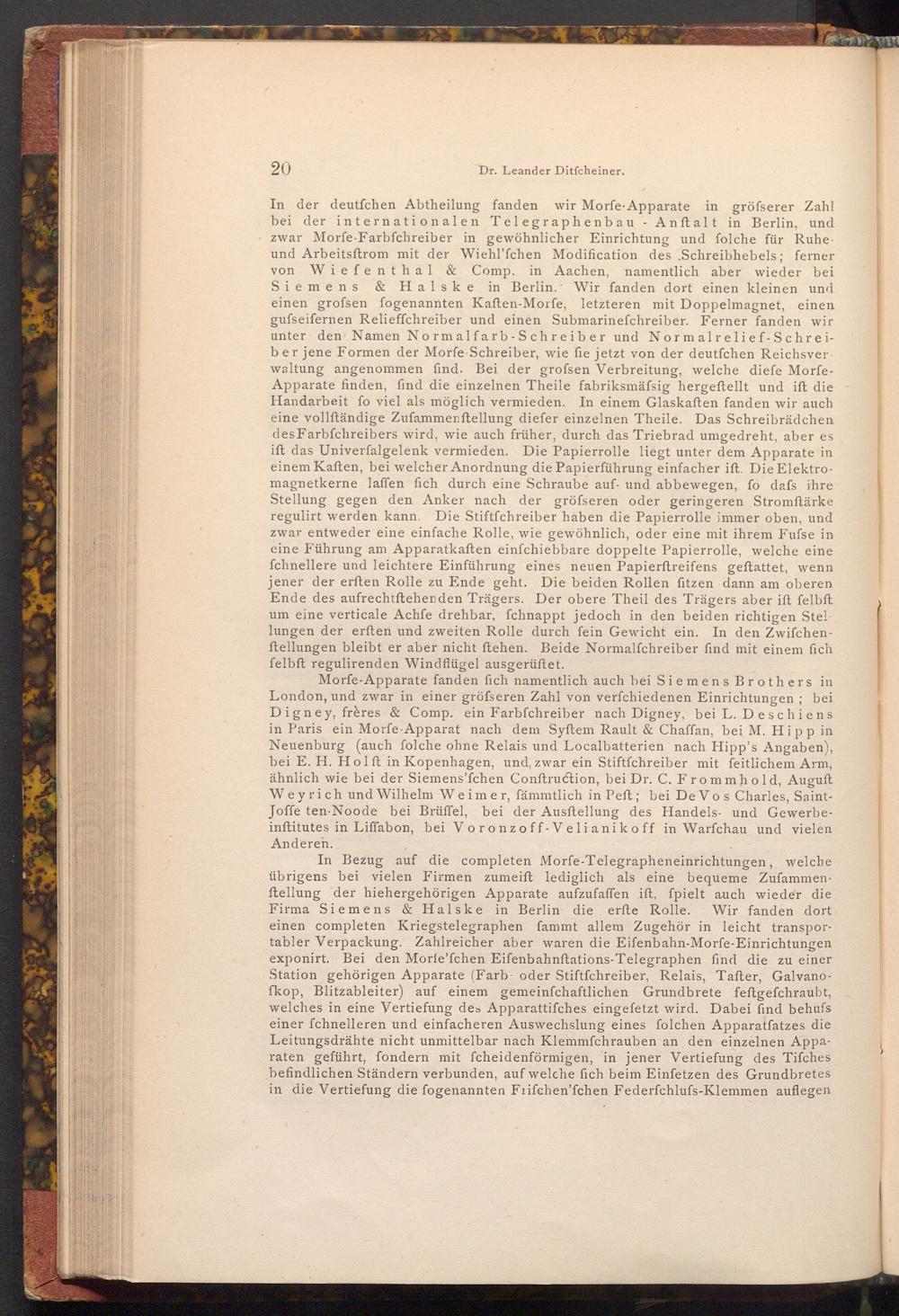 Morfe- Apparate fanden fich namentlich auch bei Siemens Brothers in London, und zwar in einer gröfseren Zahl von verfchiedenen Einrichtungen; bei Digney, frères& Comp. ein Farbfchreiber nach Digney, bei L. Deschiens in Paris ein Morfe Apparat nach dem Syftem Rault& Chaffan, bei M. Hipp in Neuenburg( auch folche ohne Relais und Localbatterien nach Hipp's Angaben), bei E. H. Holft in Kopenhagen, und, zwar ein Stiftfchreiber mit feitlichem Arm, ähnlich wie bei der Siemens'fchen Conftruction, bei Dr. C. Frommhold, Auguft Weyrich und Wilhelm Weimer, fämmtlich in Peft; bei De Vos Charles, SaintJoffe ten- Noode bei Brüffel, bei der Ausftellung des Handels- und Gewerbeinftitutes in Liffabon, bei Voronzoff- Velianikoff in Warfchau und vielen Anderen. In Bezug auf die completen Morfe- Telegrapheneinrichtungen, welche übrigens bei vielen Firmen zumeift lediglich als eine bequeme Zuſammenftellung der hiehergehörigen Apparate aufzufaffen ift, fpielt auch wieder die Firma Siemens& Halske in Berlin die erfte Rolle. Wir fanden dort einen completen Kriegstelegraphen fammt allem Zugehör in leicht transportabler Verpackung. Zahlreicher aber waren die Eifenbahn- Morfe- Einrichtungen exponirt. Bei den Morte'fchen Eifenbahnftations- Telegraphen find die zu einer Station gehörigen Apparate( Farb oder Stiftfchreiber, Relais, Tafter, Galvanofkop, Blitzableiter) auf einem gemeinfchaftlichen Grundbrete feftgefchraubt, welches in eine Vertiefung des Apparattifches eingeſetzt wird. Dabei find behufs einer fchnelleren und einfacheren Auswechslung eines folchen Apparatfatzes die Leitungsdrähte nicht unmittelbar nach Klemmfchrauben an den einzelnen Apparaten geführt, fondern mit fcheidenförmigen, in jener Vertiefung des Tifches befindlichen Ständern verbunden, auf welche fich beim Einfetzen des Grundbretes in die Vertiefung die fogenannten Frifchen'fchen Federfchlufs- Klemmen auflegen