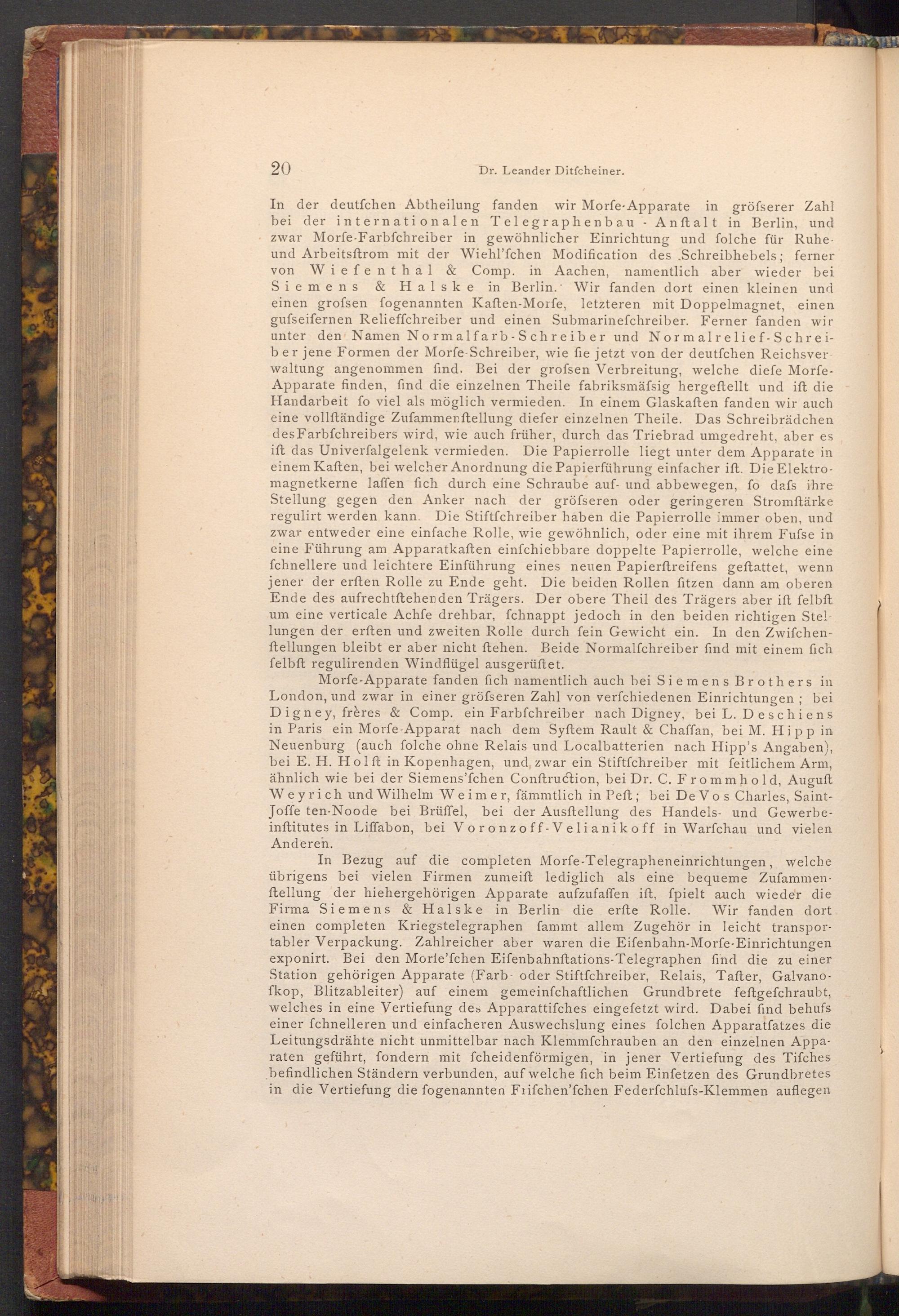 In der deutfchen Abtheilung fanden wir Morfe Apparate in gröfserer Zahl bei der internationalen Telegraphenbau Anftalt in Berlin, und zwar Morfe Farbfchreiber in gewöhnlicher Einrichtung und folche für Ruheund Arbeitsftrom mit der Wiehl'fchen Modification des Schreibhebels; ferner von Wiefenthal& Comp. in Aachen, namentlich aber wieder bei Siemens& Halske in Berlin. Wir fanden dort einen kleinen und einen grofsen fogenannten Kaften- Morfe, letzteren mit Doppelmagnet, einen gufseifernen Relieffchreiber und einen Submarinefchreiber. Ferner fanden wir unter den Namen Normalfarb- Schreiber und Normalrelief- Schreiberjene Formen der Morfe Schreiber, wie fie jetzt von der deutfchen Reichsverwaltung angenommen find. Bei der grofsen Verbreitung, welche diefe MorfeApparate finden, find die einzelnen Theile fabriksmäfsig hergeftellt und ift die Handarbeit fo viel als möglich vermieden. In einem Glaskaften fanden wir auch eine vollſtändige Zufammenftellung diefer einzelnen Theile. Das Schreibrädchen des Farbfchreibers wird, wie auch früher, durch das Triebrad umgedreht, aber es ift das Univerfalgelenk vermieden. Die Papierrolle liegt unter dem Apparate in einem Kaften, bei welcher Anordnung die Papierführung einfacher ift. Die Elektromagnetkerne laffen fich durch eine Schraube auf- und abbewegen, fo dafs ihre Stellung gegen den Anker nach der gröfseren oder geringeren Stromftärke regulirt werden kann. Die Stiftfchreiber haben die Papierrolle immer oben, und zwar entweder eine einfache Rolle, wie gewöhnlich, oder eine mit ihrem Fufse in eine Führung am Apparatkaften einfchiebbare doppelte Papierrolle, welche eine fchnellere und leichtere Einführung eines neuen Papierftreifens geftattet, wenn jener der erften Rolle zu Ende geht. Die beiden Rollen fitzen dann am oberen Ende des aufrechtſtehenden Trägers. Der obere Theil des Trägers aber ift felbft um eine verticale Achfe drehbar, fchnappt jedoch in den beiden richtigen Stellungen der erften und zweiten Rolle durch fein Gewicht ein. In den Zwifchenftellungen bleibt er aber nicht ftehen. Beide Normalfchreiber find mit einem fich felbft regulirenden Windflügel ausgerüftet.
