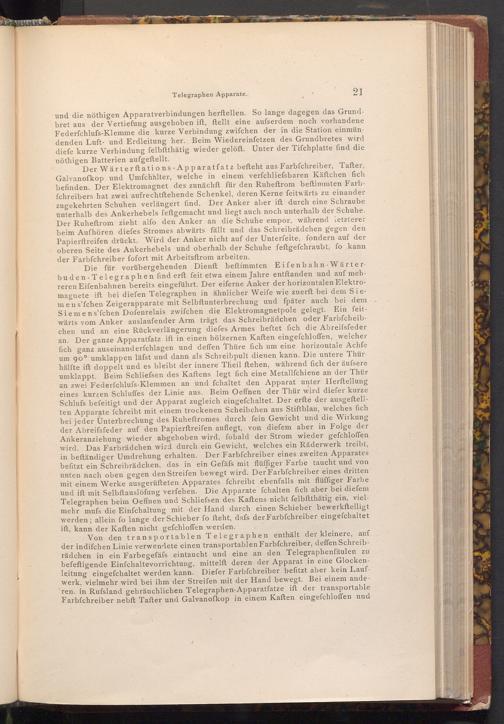 Die für vorübergehenden Dienft beftimmten Eifenbahn- Wärterbuden Telegraphen find erft feit etwa einem Jahre entftanden und auf meh reren Eifenbahnen bereits eingeführt. Der eiferne Anker der horizontalen Elektromagnete ift bei diefen Telegraphen in ähnlicher Weife wie zuerft bei dem Siemens'fchen Zeigerapparate mit Selbftunterbrechung und später auch bei dem Siemens'fchen Dofenrelais zwifchen die Elektromagnetpole gelegt. Ein feitwärts vom Anker auslaufender Arm trägt das Schreibrädchen oder Farbfcheibchen und an eine Rückverlängerung diefes Armes heftet fich die Abreifsfeder an. Der ganze Apparatfatz ift in einen hölzernen Kaften eingefchloffen, welcher fich ganz auseinanderfchlagen und deffen Thüre fich um eine horizontale Achfe um 90° umklappen läfst und dann als Schreibpult dienen kann. Die untere Thür hälfte ift doppelt und es bleibt der innere Theil ftehen, während fich der äussere umklappt. Beim Schliefsen des Kaftens legt fich eine Metallfchiene an der Thür an zwei Federfchlufs- Klemmen an und fchaltet den Apparat unter Herſtellung eines kurzen Schluffes der Linie aus. Beim Oeffnen der Thür wird diefer kurze Schlufs befeitigt und der Apparat zugleich eingefchaltet. Der erfte der ausgeftellten Apparate fchreibt mit einem trockenen Scheibchen aus Stiftblau, welches fich bei jeder Unterbrechung des Ruheftromes durch fein Gewicht und die Wirkung der Abreifsfeder auf den Papierftreifen auflegt, von diefem aber in Folge der Ankeranziehung wieder abgehoben wird, fobald der Strom wieder gefchloffen wird. Das Farbrädchen wird durch ein Gewicht, welches ein Räderwerk treibt, in beftändiger Umdrehung erhalten. Der Farbfchreiber eines zweiten Apparates befitzt ein Schreibrädchen, das in ein Gefäfs mit flüffiger Farbe taucht und von unten nach oben gegen den Streifen bewegt wird. Der Farbfchreiber eines dritten mit einem Werke ausgerüfteten Apparates fchreibt ebenfalls mit flüffiger Farbe und ift mit Selbftauslöfung verfehen. Die Apparate fchalten fich aber bei diefem Telegraphen beim Oeffnen und Schliefsen des Kaftens nicht felbftthätig ein, vielmehr mufs die Einfchaltung mit der Hand durch einen Schieber bewerkstelligt werden; allein fo lange der Schieber fo fteht, dafs der Farbfchreiber eingefchaltet ift, kann der Kaften nicht gefchloffen werden.