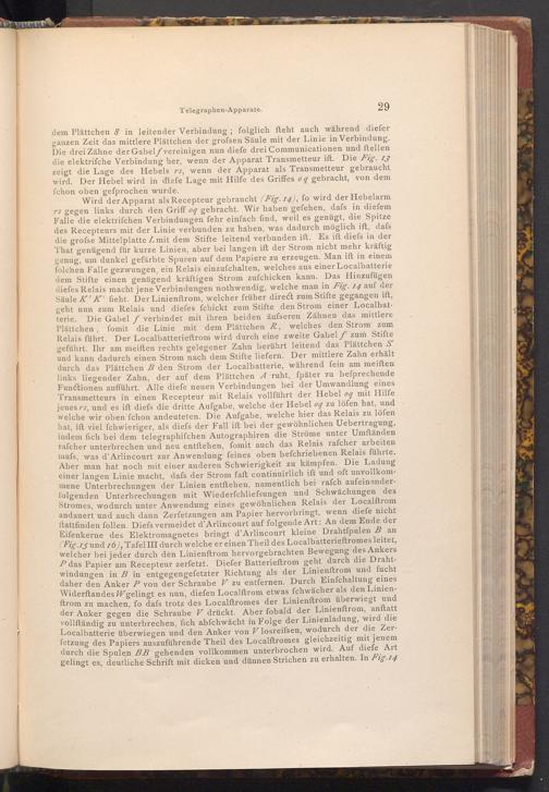 Wird der Apparat als Recepteur gebraucht( Fig. 14), fo wird der Hebelarm rs gegen links durch den Griff og gebracht. Wir haben gefehen, dafs in diefem Falle die elektrifchen Verbindungen fehr einfach find, weil es genügt, die Spitze des Recepteurs mit der Linie verbunden zu haben, was dadurch möglich ift, dafs die grofse Mittelplatte L mit dem Stifte leitend verbunden ift. Es ift diefs in der That genügend für kurze Linien, aber bei langen ift der Strom nicht mehr kräftig genug, um dunkel gefärbte Spuren auf dem Papiere zu erzeugen. Man ift in einem folchen Falle gezwungen, ein Relais einzufchalten, welches aus einer Localbatterie dem Stifte einen genügend kräftigen Strom zufchicken kann. Das Hinzufügen diefes Relais macht jene Verbindungen nothwendig, welche man in Fig. 14 auf der Säule K K fieht. Der Linienftrom, welcher früher direct zum Stifte gegangen ift, geht nun zum Relais und diefes fchickt zum Stifte den Strom einer Localbatterie. Die Gabel f verbindet mit ihren beiden äufseren Zähnen das mittlere Plättchen, fomit die Linie mit dem Plättchen R, welches den Strom zum Relais führt. Der Localbatterieftrom wird durch eine zweite Gabel f' zum Stifte geführt. Ihr am meiften rechts gelegener Zahn berührt leitend das Plättchen S' und kann dadurch einen Strom nach dem Stifte liefern. Der mittlere Zahn erhält durch das Plättchen B den Strom der Localbatterie, während fein am meiften links liegender Zahn, der auf dem Plättchen A ruht, fpäter zu befprechende Functionen aufführt. Alle diefe neuen Verbindungen bei der Umwandlung eines Transmetteurs in einen Recepteur mit Relais vollführt der Hebel og mit Hilfe jenes rs, und es ift diefs die dritte Aufgabe, welche der Hebel oq zu löfen hat, und welche wir oben fchon andeuteten. Die Aufgabe, welche hier das Relais zu löfen hat, ift viel fchwieriger, als diefs der Fall ist bei der gewöhnlichen Uebertragung, indem fich bei dem telegraphifchen Autographiren die Ströme unter Umständen rafcher unterbrechen und neu entſtehen, fomit auch das Relais rafcher arbeiten mufs, was d'Arlincourt zur Anwendung feines oben befchriebenen Relais führte. Aber man hat noch mit einer anderen Schwierigkeit zu kämpfen. Die Ladung einer langen Linie macht, dafs der Strom faft continuirlich ift und oft unvollkommene Unterbrechungen der Linien entſtehen, namentlich bei rafch aufeinanderfolgenden Unterbrechungen mit Wiederfchliefsungen und Schwächungen des Stromes, wodurch unter Anwendung eines gewöhnlichen Relais der Localftrom andauert und auch dann Zerfetzungen am Papier hervorbringt, wenn diefe nicht ftattfinden follen. Diefs vermeidet d'Arlincourt auf folgende Art: An dem Ende der Eifenkerne des Elektromagnetes bringt d'Arlincourt kleine Drahtfpulen B an ( Fig.15 und 16), Tafel III durch welche er einen Theil des Localbatterieftromes leitet, welcher bei jeder durch den Linienftrom hervorgebrachten Bewegung des Ankers P das Papier am Recepteur zerfetzt. Diefer Batterieftrom geht durch die Drahtwindungen in B in entgegengefetzter Richtung als der Linienftrom und fucht daher den Anker P von der Schraube V zu entfernen. Durch Einfchaltung eines Widerftandes Wgelingt es nun, diefen Localftrom etwas fchwächer als den Linienftrom zu machen, fo dafs trotz des Localftromes der Linienftrom überwiegt und der Anker gegen die Schraube V drückt. Aber fobald der Linienftrom, anftatt vollſtändig zu unterbrechen, fich abfchwächt in Folge der Linienladung, wird die Localbatterie überwiegen und den Anker von V losreifsen, wodurch der die Zerfetzung des Papiers auszuführende Theil des Localftromes gleichzeitig mit jenem durch die Spulen BB gehenden vollkommen unterbrochen wird. Auf diefe Art gelingt es, deutliche Schrift mit dicken und dünnen Strichen zu erhalten. In Fig.14