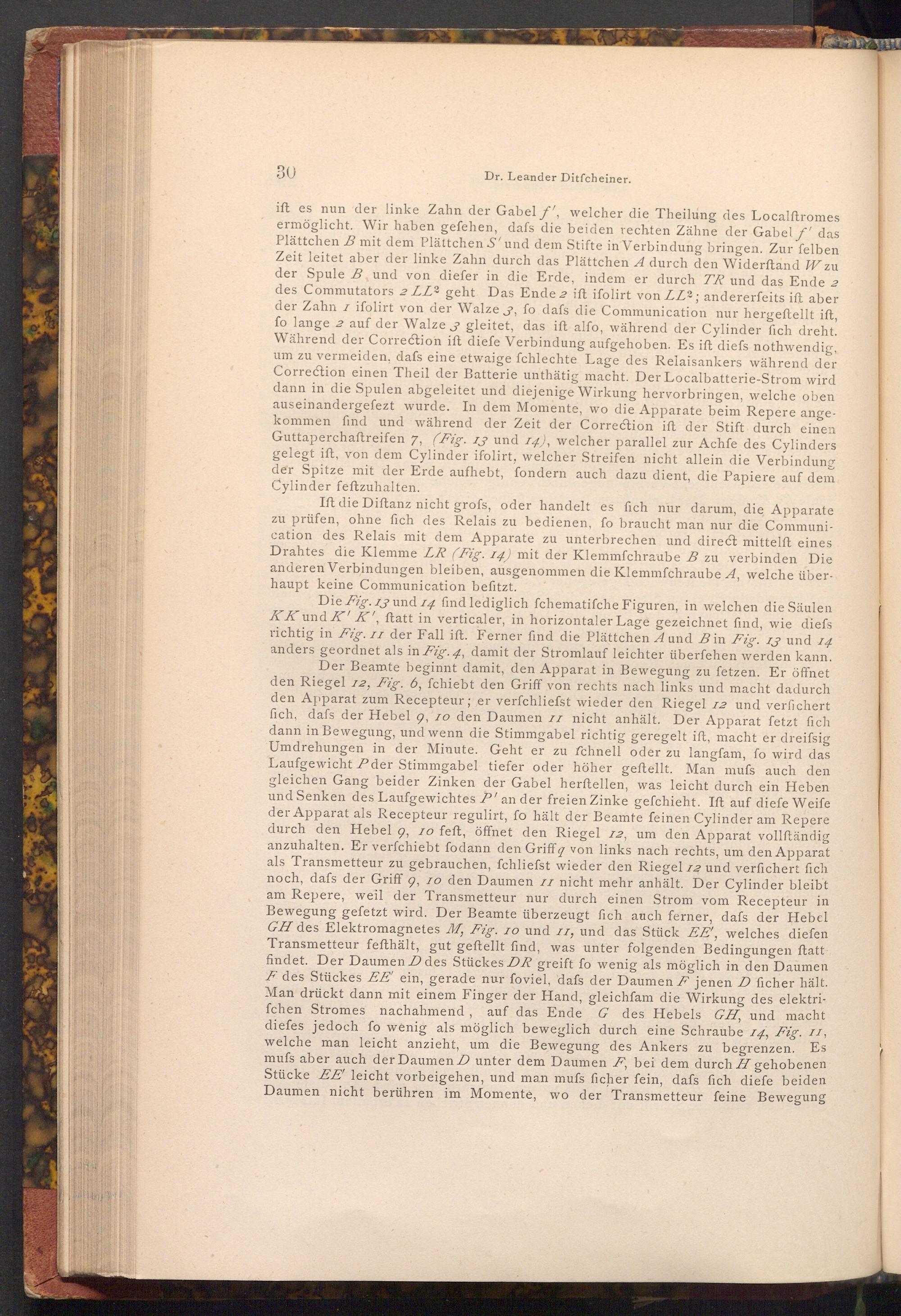 ift es nun der linke Zahn der Gabel f', welcher die Theilung des Localftromes ermöglicht. Wir haben gefehen, dafs die beiden rechten Zähne der Gabel f' das Plättchen B mit dem Plättchen S' und dem Stifte in Verbindung bringen. Zur felben Zeit leitet aber der linke Zahn durch das Plättchen A durch den Widerftand W zu der Spule B, und von diefer in die Erde, indem er durch TR und das Ende 2 des Commutators 2 LL2 geht Das Ende 2 ift ifolirt von LL2; andererfeits ift aber der Zahn ifolirt von der Walze 3, fo dafs die Communication nur hergestellt ist, fo lange 2 auf der Walze 3 gleitet, das ift alfo, während der Cylinder fich dreht. Während der Correction ift diefe Verbindung aufgehoben. Es ift diefs nothwendig, um zu vermeiden, dafs eine etwaige fchlechte Lage des Relaisankers während der Correction einen Theil der Batterie unthätig macht. Der Localbatterie- Strom wird dann in die Spulen abgeleitet und diejenige Wirkung hervorbringen, welche oben auseinandergefezt wurde. In dem Momente, wo die Apparate beim Repere angekommen find und während der Zeit der Correction ift der Stift durch einen Guttaperchaftreifen 7,( Fig. 13 und 14), welcher parallel zur Achfe des Cylinders gelegt ift, von dem Cylinder ifolirt, welcher Streifen nicht allein die Verbindung der Spitze mit der Erde aufhebt, fondern auch dazu dient, die Papiere auf dem Cylinder feftzuhalten.