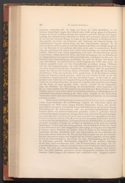 Depefche abdrucken foll. So lange ein Strom die Linie durchfliefst, ift der Rahmen fammt Papier gegen den Cylinder oder, beffer gefagt, gegen die fchraubenförmige mit Farbe verfehene Klinge des Cylinders gedrückt. Da nun die Längenrichtung des Papierftreifens fenkrecht zur Achfe des rotirenden Cylinders geftellt ift, fo wird die rotirende Klinge, fo lange fie mit dem Papiere in Berührung fteht, eine parallel zur Achfe des Cylinders, alfo fenkrecht zur Längenrichtung des Papierftreifens liegende dunkle Linie auf dem Papierftreifen erzeugen. So oft aber der Strom unterbrochen ift, wird der Rahmen mit Hilfe eines Elektromagnetes von der Schneide fo weit entfernt, dafs diefe nicht mehr in unmittelbarer Berührung mit dem Papiere ift, und fo eine weifse Unterbrechung des dunklen Streifens entfteht. Während einer vollen Umdrehung wird auch der Papierftreifen um ein kleines Stück, entſprechend der Höhe eines Schraubenganges der das Rädchen an der Abgabeftation bewegenden Mikrometerfchraube, verfchoben, fo dafs, wie das Rädchen einen Schraubengang durchlaufen hat, auch die Klinge den Druck an dem einen Rande des Papierftreifens wieder beginnt und fomit eine neue, zur früheren parallele Linie auf dem Papierftreifen zu ziehen vermag. Während alfo hier die Originaldepefche auf einer Walze aufgewickelt ift, wird ihre Copie auf einen ebenen Papierftreifen abgedrückt, und fo zwar, dafs die metallifchen Stellen der erfteren auf letzterem dunkel erfcheinen. Hat man alfo die Depefche mit fchwarzer Tinte auf zinnweifse Folie gefchrieben, fo ift die Copie in weifsen Linien auf dunklem Grunde gegeben. Auch find jene Punkte, welche in der aufgewickelten Originaldepefche auf einer Kreislinie liegen, in der Copie in einer geraden Linie fenkrecht zur Längenrichtung des Papierftreifens, fowie alle Punkte, welche in der Originaldepefche auf einer zur Cylinderachfe parallelen Linie liegen, auf der Copie in einer geraden Linie, welche parallel ift zur Längenrichtung des Streifens. Die Einrichtung der Druckfchraube diefes Apparates hat Meyer auch benützt zum Wiedergeben der gewöhnlichen Morfe- Zeichen, und ift diefelbe auch bei dem weiter unten zu befchreibenden Meyer'fchen Apparate zur mehrfachen Depefchenvermittlung auf einer Linie, welcher in der Ausstellung unmittelbar neben dem eben befchriebenen Apparate zu finden war, in Anwendung gebracht worden.
