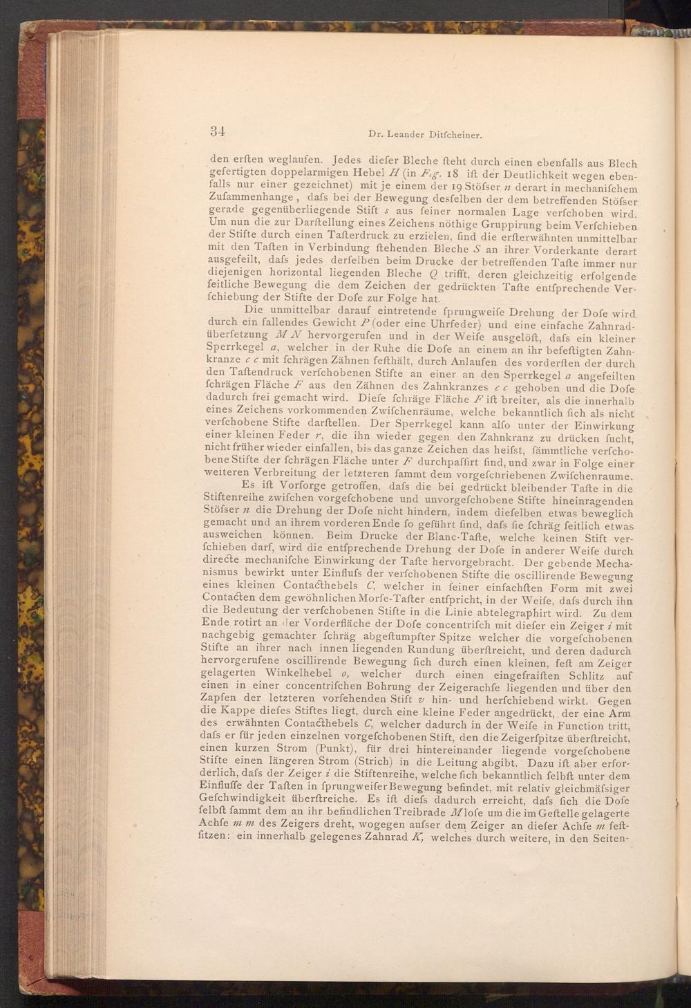 Die unmittelbar darauf eintretende fprungweife Drehung der Dofe wird durch ein fallendes Gewicht P( oder eine Uhrfeder) und eine einfache Zahnradüberfetzung M N hervorgerufen und in der Weife ausgelöft, dafs ein kleiner Sperrkegel a, welcher in der Ruhe die Dofe an einem an ihr befeftigten Zahnkranze c c mit fchrägen Zähnen fefthält, durch Anlaufen des vorderften der durch den Taftendruck verfchobenen Stifte an einer an den Sperrkegel a angefeilten fchrägen Fläche F aus den Zähnen des Zahnkranzes cc gehoben und die Dofe dadurch frei gemacht wird. Diefe fchräge Fläche Fift breiter, als die innerhalb eines Zeichens vorkommenden Zwifchenräume, welche bekanntlich fich als nicht verfchobene Stifte darftellen. Der Sperrkegel kann alfo unter der Einwirkung einer kleinen Feder r, die ihn wieder gegen den Zahnkranz zu drücken fucht, nicht früher wieder einfallen, bis das ganze Zeichen das heifst, fämmtliche verfchobene Stifte der fchrägen Fläche unter F durchpaffirt find, und zwar in Folge einer weiteren Verbreitung der letzteren fammt dem vorgefchriebenen Zwifchenraume. Es ift Vorforge getroffen, dafs die bei gedrückt bleibender Tafte in die Stiftenreihe zwifchen vorgefchobene und unvorgefchobene Stifte hineinragenden Stöfser n die Drehung der Dofe nicht hindern, indem diefelben etwas beweglich gemacht und an ihrem vorderen Ende fo geführt find, dafs fie fchräg feitlich etwas ausweichen können. Beim Drucke der Blanc- Tafte, welche keinen Stift verfchieben darf, wird die entfprechende Drehung der Dofe in anderer Weife durch directe mechanifche Einwirkung der Tafte hervorgebracht. Der gebende Mechanismus bewirkt unter Einfluss der verfchobenen Stifte die oscillirende Bewegung eines kleinen Contacthebels C, welcher in feiner einfachften Form mit zwei Contacten dem gewöhnlichen Morfe- Tafter entſpricht, in der Weife, dafs durch ihn die Bedeutung der verfchobenen Stifte in die Linie abtelegraphirt wird. Zu dem Ende rotirt an der Vorderfläche der Dofe concentrifch mit diefer ein Zeiger i mit nachgebig gemachter fchräg abgeftumpfter Spitze welcher die vorgefchobenen Stifte an ihrer nach innen liegenden Rundung überftreicht, und deren dadurch hervorgerufene oscillirende Bewegung fich durch einen kleinen, feft am Zeiger gelagerten Winkelhebel o, welcher durch einen eingefraiften Schlitz auf einen in einer concentrifchen Bohrung der Zeigerachfe liegenden und über den Zapfen der letzteren vorfehenden Stift hin- und herfchiebend wirkt. Gegen die Kappe diefes Stiftes liegt, durch eine kleine Feder angedrückt, der eine Arm des erwähnten Contacthebels C, welcher dadurch in der Weife in Function tritt, dafs er für jeden einzelnen vorgefchobenen Stift, den die Zeigerfpitze überftreicht, einen kurzen Strom( Punkt), für drei hintereinander liegende vorgefchobene Stifte einen längeren Strom( Strich) in die Leitung abgibt. Dazu ift aber erforderlich, dafs der Zeiger i die Stiftenreihe, welche fich bekanntlich felbft unter dem Einfluffe der Taften in fprungweifer Bewegung befindet, mit relativ gleichmäfsiger Gefchwindigkeit überftreiche. Es ift diefs dadurch erreicht, dafs fich die Dofe felbft fammt dem an ihr befindlichen Treibrade Mlofe um die im Geftelle gelagerte Achfe m m des Zeigers dreht, wogegen aufser dem Zeiger an diefer Achfe m feftfitzen: ein innerhalb gelegenes Zahnrad K, welches durch weitere, in den Seiten
