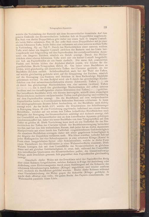 welche die Verbindung der Batterie mit dem Stromvertheiler vermitteln. Auf dem ganzen Umkreife des Stromvertheilers befinden fich 16 Doppelftäbe angebracht. Ein Stab von diefen Doppelftäben gibt daher nur einen halb fo langen Contact. als beide Stäbe zufammen. Nun ift der erfte Stab eines Doppelftabes mit je einer oberen fchwarzen Tafte, beide Stäbe aber zufammen mit einer unteren weifsen Tafte in Verbindung. Fig. 22, Taf. V. Durch das Niederdrücken einer unteren weifsen Tafte wird daher ein längerer Contact zwifchen der Batterie und der Linie hervorgebracht und folgerichtig auf den Papierftreifen des correfpondirenden Apparates ein längeres Zeichen, nämlich ein Strich erzeugt. Durch das Niederdrücken einer oberen fchwarzen Tafte wird nur ein kurzer Contact hergeftellt, der fich am Papierftreifen als ein Punkt darftellt. Punkte und Striche bilden das Alphabet ähnlich jenem, wie folches für die Um daher einen Buchstaben zu gewöhnlichen Morfe- Telegraphen üblich ift. bilden, wird gleichzeitig auf ebenfoviele Taften der Claviatur gedrückt, als der Buchftabe Zeichen enthält. Selbſtverſtändlich mufs bei der Wahl der Taften, auf welche gleichzeitig gedrückt wird, auf die Gruppirung der Zeichen, nämlich auf die Erzeugung von Punkten und Strichen in ihrer Reihenfolge Rückficht genommen werden. So zum Beiſpiel wird ein S durch das gleichzeitige Niederdrücken von drei nebeneinanderftehenden oberen( fchwarzen) Taften(...), ein ch durch das gleichzeitige Niederdrücken von vier unteren( weiſsen) Taften (--), ein b durch das gleichzeitige Niederdrücken der erften unteren ( weifsen) und der darauffolgenden oberen( fchwarzen) drei Taften(...) gebildet. Der betreffende Buchftabe wird, wie hieraus hervorgeht, mittelft eines einmaligen Niederdrückens mehrerer entsprechender Taften auch gleichzeitig und vollſtändig auf dem Papierftreifen erzeugt. Da die Buchftaben auf dem entſprechenden Papierftreifen beider in Correfpondenz ftehenden Stationen erfcheinen, fo kann der abtelegraphirende Beamte fofort beobachten, ob der Buchftabe auch richtig erzeugt wird. An der Achfe GG1, welche die Druckwalzen der Schrifterzeuger in Bewegung fetzen, ift eine Vorrichtung angebracht, beftehend aus einem dünnen Metallftabe, welcher auf ein neben den Taften befindliches Holzftückchen nach Mafsgabe der Bewegung des Stromvertheilers anfchlägt und dadurch anzeigt, dafs der Contactftift am Stromvertheiler den zu dem betreffenden Apparate gehörigen Quadranten paffirt hat, daher ein neuer Buchftabe von dem Telegraphiften auf dem Tafter zu greifen ift. Diefe Vorrichtung kann auch als ein Tactirftab für das Niederdrücken der Taften der Claviatur behufs der Buchftabenerzeugung betrachtet werden und hat den fehr wefentlichen Nutzen, dafs jeder der an diefen Apparaten Manipulirende mit einer durch den Tactirftab vorgefchriebenen Gefchwindigkeit die einzelnen Buchftaben erzeugen, daher mit einer gegebenen Schnelligkeit in der Abgabe der Depefchen verfahren mufs. Wie fchon erwähnt, befindet fich auf jeder Meffingwalze der vier Schreibapparate je eine erhabene Klinge( Kante) in Form einer langgedehnten Spiral- oder Schraubenlinie, welche in diefer Form einen Viertelkreis des Durchfchnittes je einer Walzenoberfläche einnimmt. Diefe Walzen bewegen fich mit dem Contactftifte des Stromvertheilers in gleichem Sinne und mit gleicher Gefchwindigkeit, fo zwar, dafs, während der Contactftift den betreffenden Quadranten des Stromvertheilers paffirt, die fchraubenförmige Klinge, auch Drucklinie genannt, fich gegenüber dem Papierftreifen gleichmäfsig bewegt.