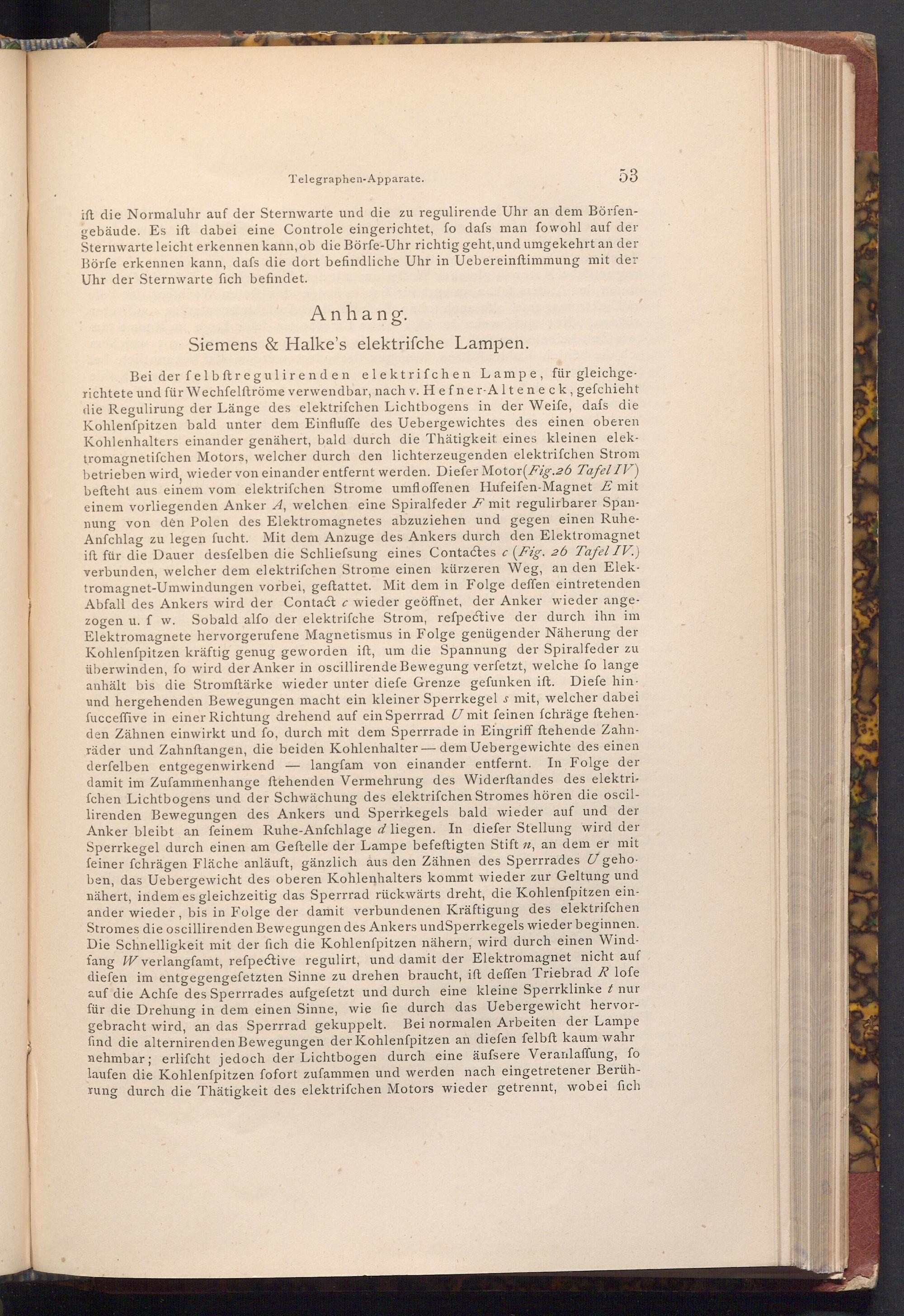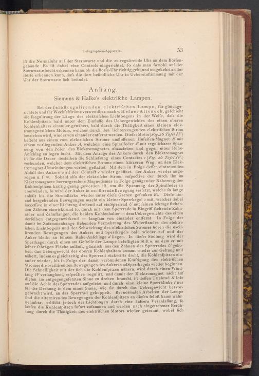 Bei der felbft regulirenden elektrifchen Lampe, für gleichgerichtete und für Wechfelftröme verwendbar, nach v. Hefner Alteneck, gefchieht die Regulirung der Länge des elektriſchen Lichtbogens in der Weife, dafs die Kohlenfpitzen bald unter dem Einfluffe des Uebergewichtes des einen oberen Kohlenhalters einander genähert, bald durch die Thätigkeit eines kleinen elektromagnetifchen Motors, welcher durch den lichterzeugenden elektrifchen Strom betrieben wird, wieder von einander entfernt werden. Diefer Motor( Fig.26 Tafel IV) befteht aus einem vom elektrifchen Strome umfloffenen Hufeifen- Magnet E mit einem vorliegenden Anker A, welchen eine Spiralfeder F mit regulirbarer Spannung von den Polen des Elektromagnetes abzuziehen und gegen einen RuheAnfchlag zu legen fucht. Mit dem Anzuge des Ankers durch den Elektromagnet ift für die Dauer desfelben die Schliefsung eines Contactes c( Fig. 26 Tafel IV.) verbunden, welcher dem elektrifchen Strome einen kürzeren Weg, an den Elektromagnet- Umwindungen vorbei, geftattet. Mit dem in Folge deffen eintretenden Abfall des Ankers wird der Contact c wieder geöffnet, der Anker wieder angezogen u. f w. Sobald alfo der elektriſche Strom, refpective der durch ihn im Elektromagnete hervorgerufene Magnetismus in Folge genügender Näherung der Kohlenfpitzen kräftig genug geworden ist, um die Spannung der Spiralfeder zu überwinden, fo wird der Anker in oscillirende Bewegung verfetzt, welche fo lange anhält bis die Stromftärke wieder unter diefe Grenze gefunken ift. Diefe hin und hergehenden Bewegungen macht ein kleiner Sperrkegel s mit, welcher dabei fucceffive in einer Richtung drehend auf ein Sperrrad U mit feinen fchräge ſtehenden Zähnen einwirkt und fo, durch mit dem Sperrrade in Eingriff ftehende Zahnräder und Zahnftangen, die beiden Kohlenhalter dem Uebergewichte des einen derfelben entgegenwirkend langfam von einander entfernt. In Folge der. damit im Zufammenhange ftehenden Vermehrung des Widerftandes des elektrifchen Lichtbogens und der Schwächung des elektrifchen Stromes hören die oscillirenden Bewegungen des Ankers und Sperrkegels bald wieder auf und der Anker bleibt an feinem Ruhe- Anfchlage d liegen. In diefer Stellung wird der Sperrkegel durch einen am Geftelle der Lampe befeftigten Stift n, an dem er mit feiner fchrägen Fläche anläuft, gänzlich aus den Zähnen des Sperrrades U geho. ben, das Uebergewicht des oberen Kohlenhalters kommt wieder zur Geltung und nähert, indem es gleichzeitig das Sperrrad rückwärts dreht, die Kohlenfpitzen einander wieder, bis in Folge der damit verbundenen Kräftigung des elektrifchen Stromes die oscillirenden Bewegungen des Ankers und Sperrkegels wieder beginnen. Die Schnelligkeit mit der fich die Kohlenfpitzen nähern, wird durch einen Windfang W verlangfamt, refpective regulirt, und damit der Elektromagnet nicht auf diefen im entgegengefetzten Sinne zu drehen braucht, ift deffen Triebrad R lofe auf die Achfe des Sperrrades aufgefetzt und durch eine kleine Sperrklinke t nur für die Drehung in dem einen Sinne, wie fie durch das Uebergewicht hervorgebracht wird, an das Sperrrad gekuppelt. Bei normalen Arbeiten der Lampe find die alternirenden Bewegungen der Kohlenfpitzen an diefen felbft kaum wahr nehmbar; erlifcht jedoch der Lichtbogen durch eine äufsere Veranlaffung, fo laufen die Kohlenfpitzen fofort zufammen und werden nach eingetretener Berührung durch die Thätigkeit des elektrifchen Motors wieder getrennt, wobei fich
