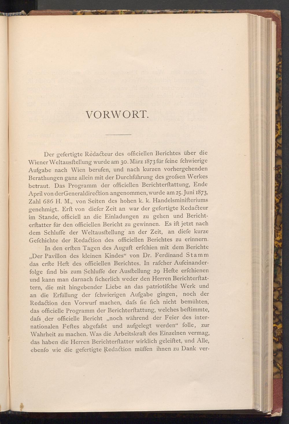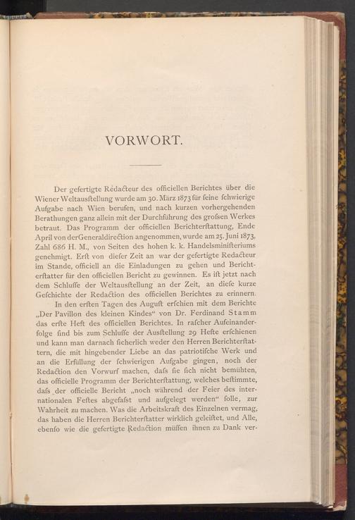 Der gefertigte Redacteur des officiellen Berichtes über die Wiener Weltausstellung wurde am 30. März 1873 für feine fchwierige Aufgabe nach Wien berufen, und nach kurzen vorhergehenden Berathungen ganz allein mit der Durchführung des grofsen Werkes betraut. Das Programm der officiellen Berichterftattung, Ende April von der Generaldirection angenommen, wurde am 25. Juni 1873, Zahl 686 H. M., von Seiten des hohen k. k. Handelsminifteriums genehmigt. Erft von diefer Zeit an war der gefertigte Redacteur im Stande, officiell an die Einladungen zu gehen und Berichterftatter für den officiellen Bericht zu gewinnen. Es iſt jetzt nach dem Schluffe der Weltausftellung an der Zeit, an diefe kurze Gefchichte der Redaction des officiellen Berichtes zu erinnern.