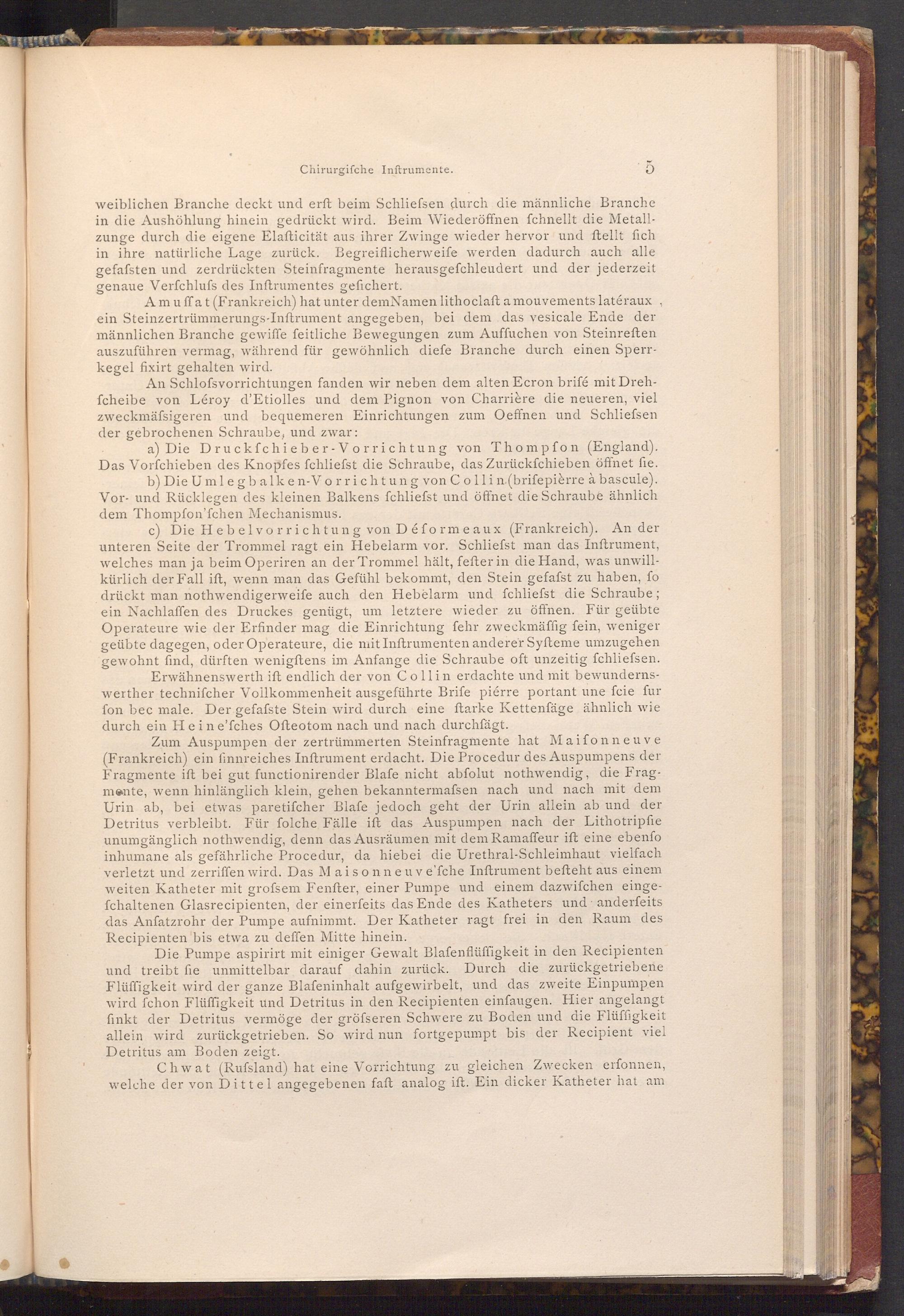 Amuffat( Frankreich) hat unter dem Namen lithoclaft a mouvements latéraux, ein Steinzertrümmerungs- Inftrument angegeben, bei dem das vesicale Ende der männlichen Branche gewiffe feitliche Bewegungen zum Auffuchen von Steinreften auszuführen vermag, während für gewöhnlich diefe Branche durch einen Sperrkegel fixirt gehalten wird.