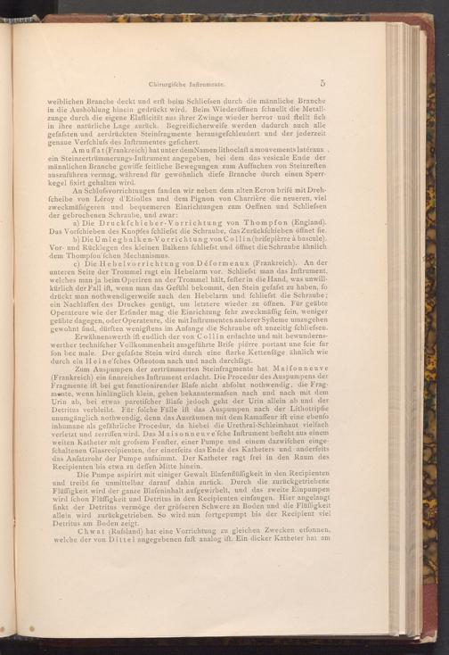Zum Auspumpen der zertrümmerten Steinfragmente hat Maifonneuve ( Frankreich) ein finnreiches Inftrument erdacht. Die Procedur des Auspumpens der Fragmente ift bei gut functionirender Blafe nicht abfolut nothwendig, die Fragmente, wenn hinlänglich klein, gehen bekanntermafsen nach und nach mit dem Urin ab, bei etwas paretifcher Blafe jedoch geht der Urin allein ab und der Detritus verbleibt. Für folche Fälle ift das Auspumpen nach der Lithotripfie unumgänglich nothwendig, denn das Ausräumen mit dem Ramaffeur ift eine ebenfo inhumane als gefährliche Procedur, da hiebei die Urethral- Schleimhaut vielfach verletzt und zerriffen wird. Das Maisonneuve'fche Inftrument befteht aus einem weiten Katheter mit grofsem Fenfter, einer Pumpe und einem dazwifchen eingefchaltenen Glasrecipienten, der einerfeits das Ende des Katheters und anderfeits das Anfatzrohr der Pumpe aufnimmt. Der Katheter ragt frei in den Raum des Recipienten bis etwa zu deffen Mitte hinein.
