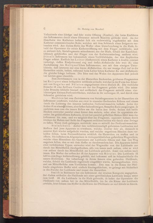 Veficalende eine fchräge und fehr weite Offnung( Fenſter), die beim Einführen des Inftrumentes durch einen Obturator mittelft Mandrin gedeckt wird. An der Handhabe des Katheters befindet fich ein rechtwinklig abgehendes mit dem Katheter communicirendes Rohr, welches mit dem Schlauch eines Irrigators verbunden wird. Aus diefem fliefst das Waffer ohne Unterbrechung in die Blafe, fobald der Operateur die axiale Katheteröffnung mit dem Finger verfchliefst, und es entleert fich, Steinfragmente mitnehmend, aus der Blafe, fobald der Kautschukfchlauch gefchloffen und der Finger von der Kathetermündung entfernt wird. Dittel's Inftrument hat bekanntlich einen Verfchlufshahn, der den ftopfenden. Finger erfetzt. Endlich hat Leiter( Oefterreich) einen Katheter à double courant verfertigt, deffen Einfpritzcanal eng und deffen Abflufsrohr fehr weit ift; eine Nachahmung des Relique t'fchen Inftrumentes, nur mit dem einzigen Unterfchiede, dafs letzteres nur eine kurze Abflufsröhre, die nur wenige Zoll tief in die Harnröhre reicht, befitzt, während beim Leiter'fchen Katheter Zu- und Abflufsrohr die gleiche Länge befitzen. Die Idee und das Wefen des Apparates find jedoch bei beiden ganz identifch.