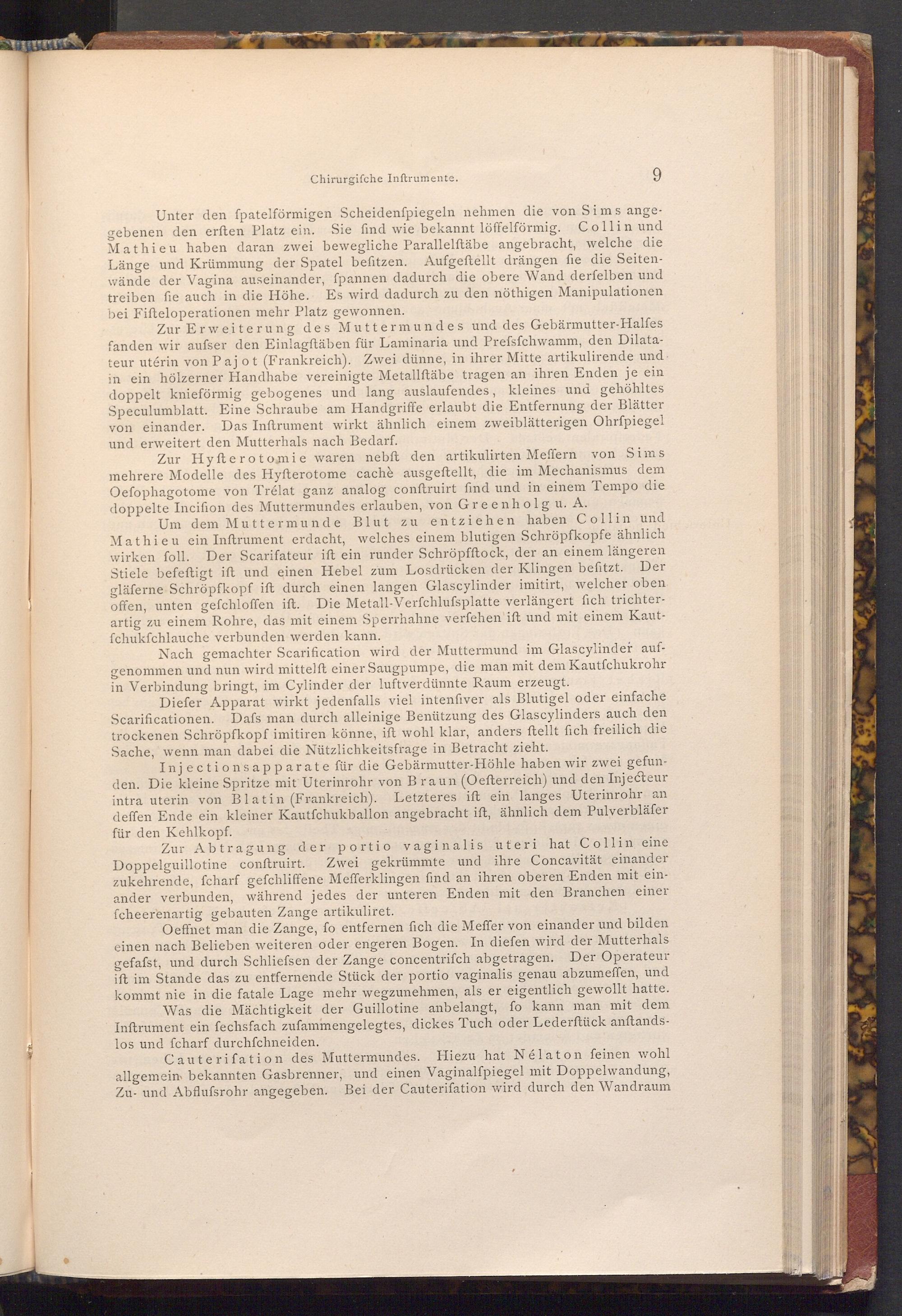 Zur Abtragung der portio vaginalis uteri hat Collin eine Doppelguillotine conftruirt. Zwei gekrümmte und ihre Concavität einander zukehrende, fcharf gefchliffene Mefferklingen find an ihren oberen Enden mit einander verbunden, während jedes der unteren Enden mit den Branchen einer fcheerenartig gebauten Zange artikuliret.