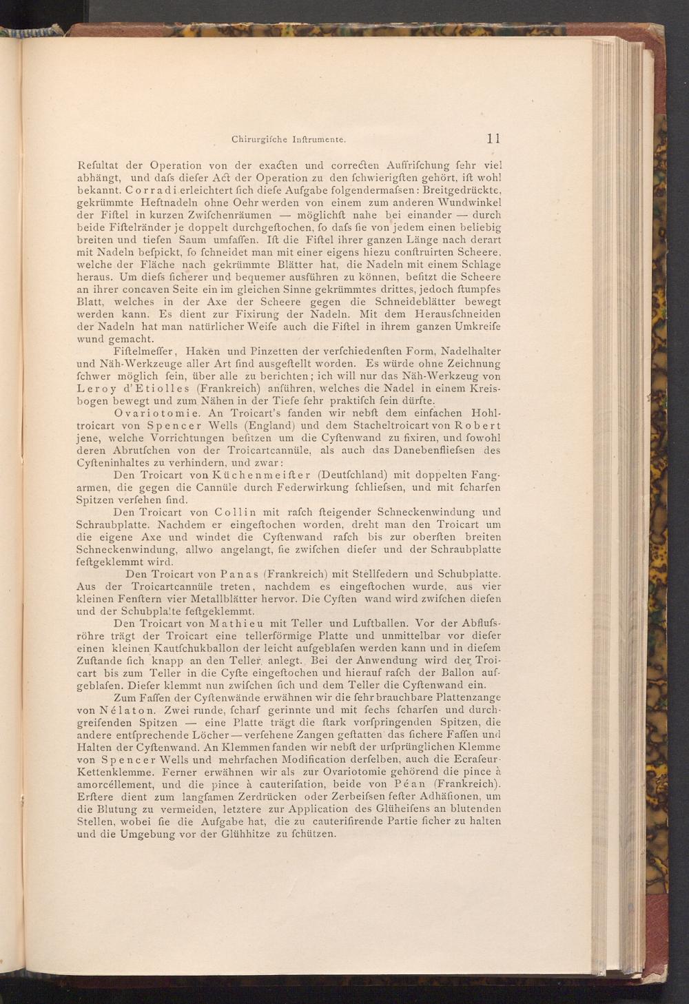 Zum Faffen der Cyftenwände erwähnen wir die fehr brauchbare Plattenzange von Nélaton. Zwei runde, fcharf gerinnte und mit fechs fcharfen und durchgreifenden Spitzen eine Platte trägt die ftark vorfpringenden Spitzen, die andere entsprechende Löcher- verfehene Zangen geftatten das fichere Faffen und Halten der Cyftenwand. An Klemmen fanden wir nebft der ursprünglichen Klemme von Spencer Wells und mehrfachen Modification derfelben, auch die Ecrafeur Kettenklemme. Ferner erwähnen wir als zur Ovariotomie gehörend die pince à amorcéllement, und die pince à cauterifation, beide von Péan( Frankreich). Erftere dient zum langfamen Zerdrücken oder Zerbeifsen fefter Adhäfionen, um die Blutung zu vermeiden, letztere zur Application des Glüheifens an blutenden Stellen, wobei fie die Aufgabe hat, die zu cauterifirende Partie ficher zu halten und die Umgebung vor der Glühhitze zu fchützen.