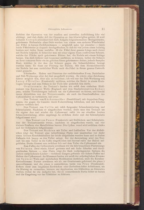 Ovariotomie. An Troicart's fanden wir nebft dem einfachen Hohltroicart von Spencer Wells( England) und dem Stacheltroicart von Robert jene, welche Vorrichtungen befitzen um die Cyftenwand zu fixiren, und fowohl deren Abrutfchen von der Troicartcannüle, als auch das Danebenfliefsen des Cyfteninhaltes zu verhindern, und zwar: