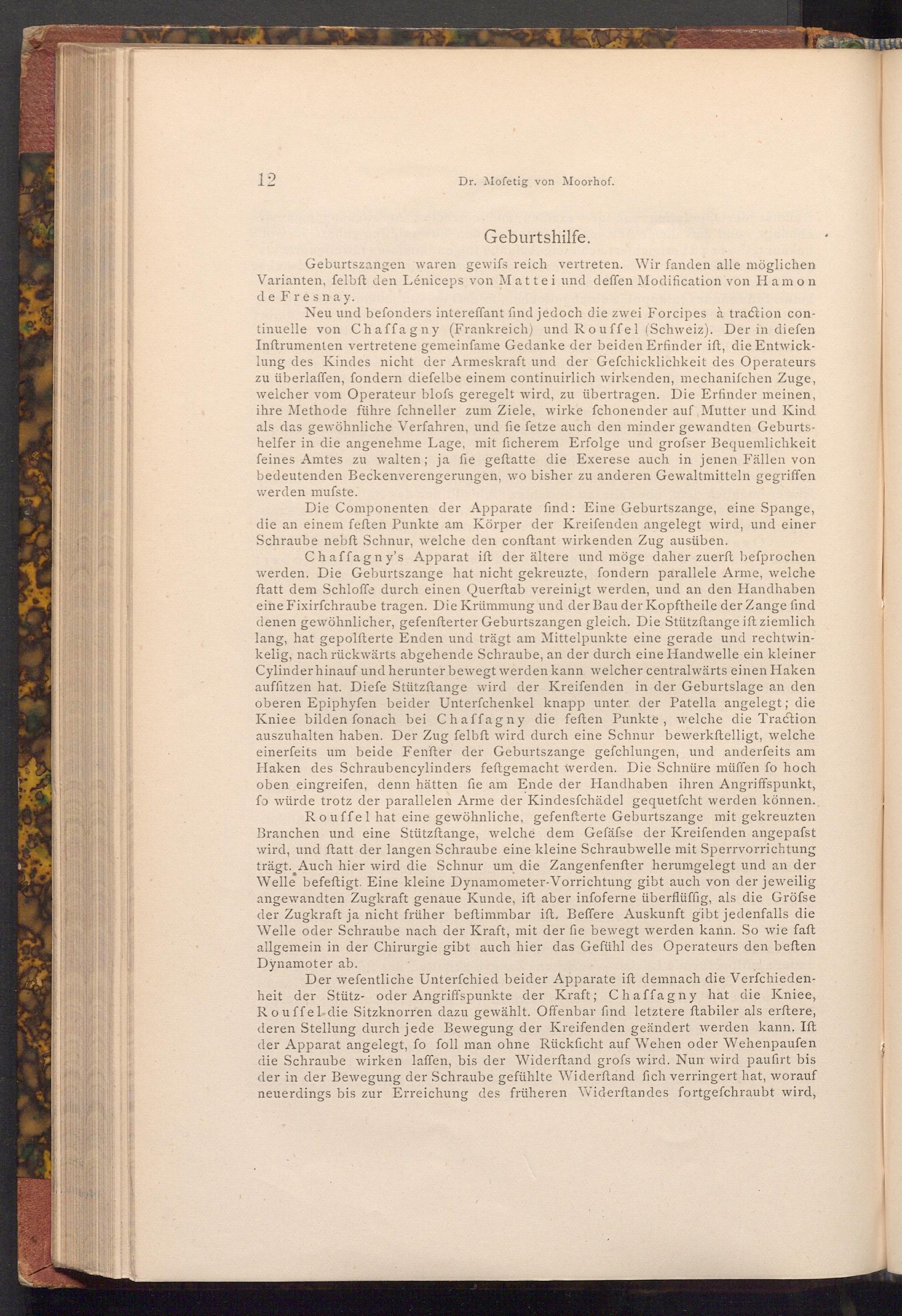 Neu und befonders intereffant find jedoch die zwei Forcipes à traction continuelle von Chaffagny( Frankreich) und Rouffel( Schweiz). Der in diefen Inftrumenten vertretene gemeinfame Gedanke der beiden Erfinder ift, die Entwicklung des Kindes nicht der Armeskraft und der Gefchicklichkeit des Operateurs zu überlaffen, fondern diefelbe einem continuirlich wirkenden, mechanifchen Zuge, welcher vom Operateur blofs geregelt wird, zu übertragen. Die Erfinder meinen, ihre Methode führe fchneller zum Ziele, wirke fchonender auf Mutter und Kind als das gewöhnliche Verfahren, und fie fetze auch den minder gewandten Geburtshelfer in die angenehme Lage, mit ficherem Erfolge und grofser Bequemlichkeit feines Amtes zu walten; ja fie geftatte die Exerese auch in jenen Fällen von bedeutenden Beckenverengerungen, wo bisher zu anderen Gewaltmitteln gegriffen werden musste.
