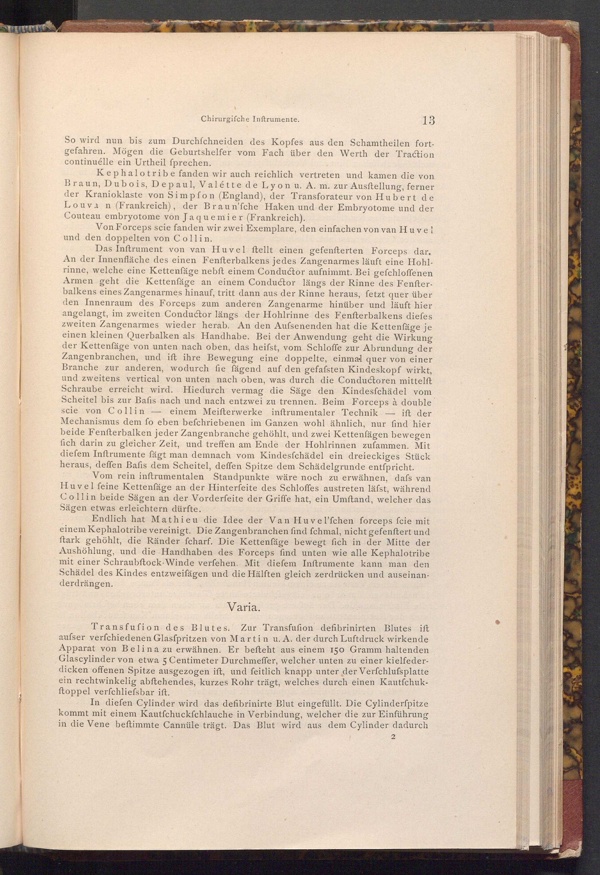 Endlich hat Mathieu die Idee der Van Huvel'fchen forceps fcie mit einem Kephalotribe vereinigt. Die Zangenbranchen find fchmal, nicht gefenftert und ftark gehöhlt, die Ränder fcharf. Die Kettenfäge bewegt fich in der Mitte der Aushöhlung, und die Handhaben des Forceps find unten wie alle Kephalotribe mit einer Schraubftock- Winde verfehen. Mit dieſem Inftrumente kann man den Schädel des Kindes entzweifägen und die Hälften gleich zerdrücken und auseinanderdrängen.