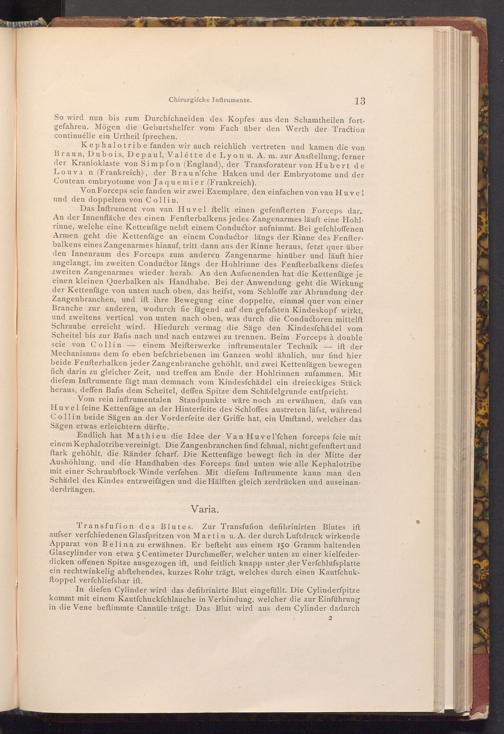 Kephalotribe fanden wir auch reichlich vertreten und kamen die von Braun, Dubois, Depaul, Valétte de Lyon u. A. m. zur Ausftellung, ferner der Kranioklaste von Simpfon( England), der Transforateur von Hubert de Louva n( Frankreich), der Braun'fche Haken und der Embryotome und der Couteau embryotome von Ja quemier( Frankreich).