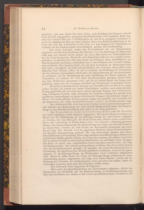 Der axiale Schenkel nimmt den Troicartftachel auf, der ftumpfwinklig angefetzte den Kautfchuckfchlauch des Cilinders. Vor der Anfetzung des Schlauches zieht man den Stachel foweit zurück, bis etwas Blut durch den Schlauchfchenkel aus der Vene herausrinnt. Hiedurch wird fämmtliche Luft aus der Cannüle herausgetrieben, zu gleicher Zeit läfst man durch den Schlauch etwas Blutflüffigkeit aus dem Recipienten ausrinnen, unmittelbar bevor man Schlauch und Cannüle mitfammen verbindet. Der Apparat fpielt, wie ich mich wiederholt zu überzeugen Geleheit hatte, vorzüglich, nur habe ich den Stachel des Troicarts durch einen vorne ftumpfen Stab erfetzen laffen, da ich es vorziehe, die Eröffnung der Venenwand mit der Scheere vorzunehmen. Noch wäre der Mantelüberzug für den Recipienten zu erwähnen, der die Beftimmung hat, jede Abkühlung des Blutes während der Transfufion zu verhüten. Er wird über den Recipienten gezogen, fobald diefer aus dem Wafferbade genommen wird, und ift an beiden Seiten der Länge nach gefpalten, damit man die Vorgänge innerhalb des Recipienten beobachten könne. Ein leicht zu handhabender Apparat zur Transfufion ift von Mathieu angegeben worden. Er beſteht aus einem Glas cylinder, welcher nach unten fpritzenförmig gefchloffen ift, und oben einen weiten, mit einer Klappe und Ventilvorrichtung verfehenen Trichter trägt. Innerhalb des Cylinders bewegt fich mittelft einer gezähnten Pumpenftange ein genau fchliefsender Stempel. Ein Zahnrad fungirt als Motor. Die Pumpenftange ift ihrer ganzen Länge nach gehöhlt, und verbindet fich am Aufsenende mit einem Kautfchukfchlauche welcher die Einfatzcannüle trägt. Das defibrinirte Blut wird durch den Trichter in den Cylinderraum gebracht, und hierauf, nach Entfernung der Luft mittelft Stempeldruck durch die Pumpenftange in den Kautfchuckfchlauch und weiter in die Vene getrieben.
