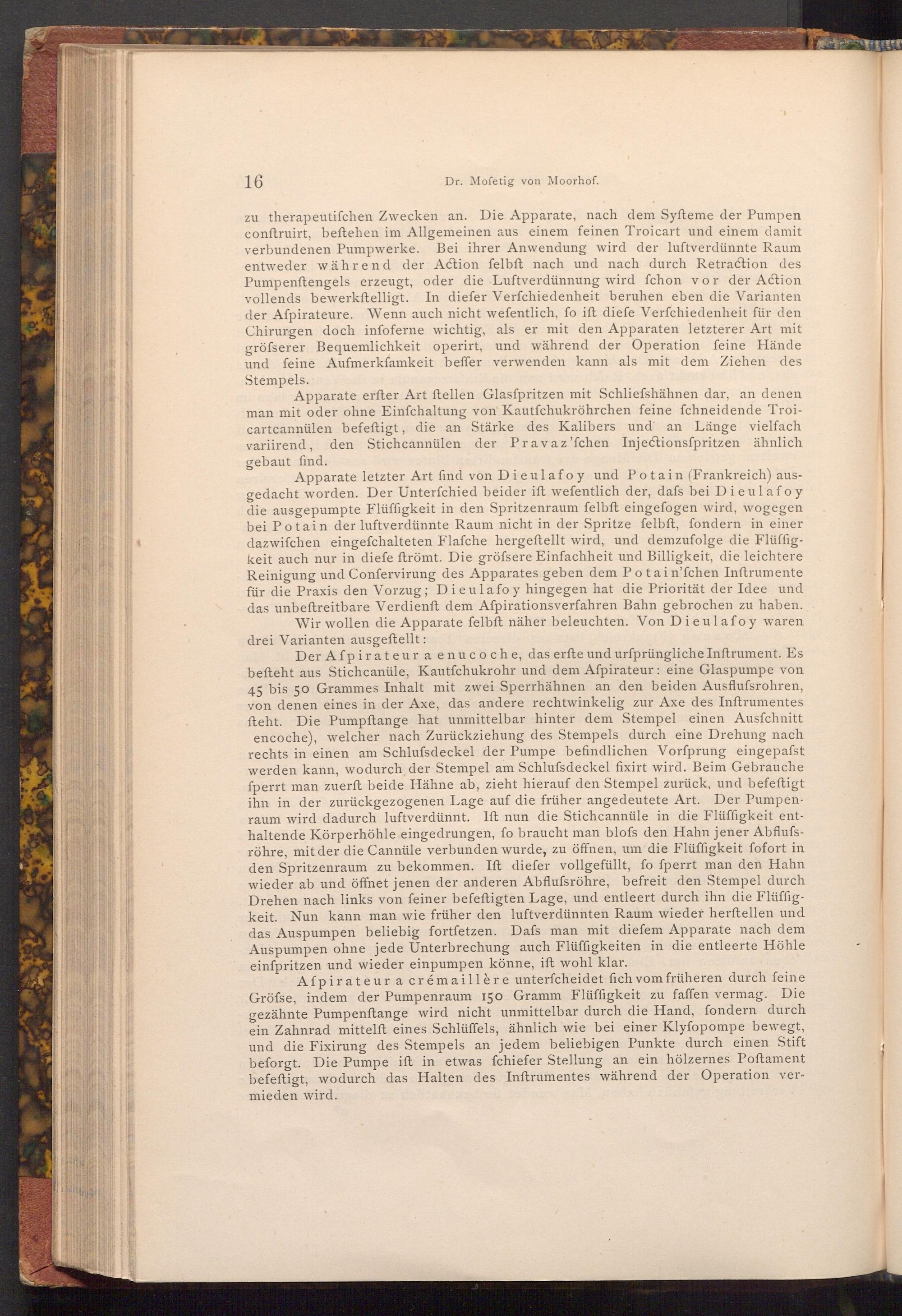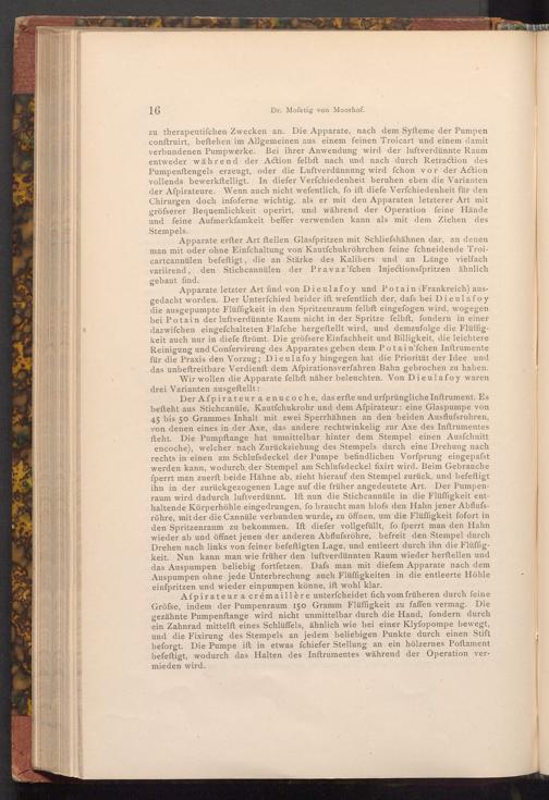 zu therapeutifchen Zwecken an. Die Apparate, nach dem Syfteme der Pumpen conftruirt, beftehen im Allgemeinen aus einem feinen Troicart und einem damit verbundenen Pumpwerke. Bei ihrer Anwendung wird der luftverdünnte Raum entweder während der Action felbft nach und nach durch Retraction des Pumpenftengels erzeugt, oder die Luftverdünnung wird fchon vor der Action vollends bewerkstelligt. In diefer Verfchiedenheit beruhen eben die Varianten der Afpirateure. Wenn auch nicht wefentlich, fo ift diefe Verfchiedenheit für den Chirurgen doch infoferne wichtig, als er mit den Apparaten letzterer Art mit gröfserer Bequemlichkeit operirt, und während der Operation feine Hände und feine Aufmerkfamkeit beffer verwenden kann als mit dem Ziehen des Stempels.