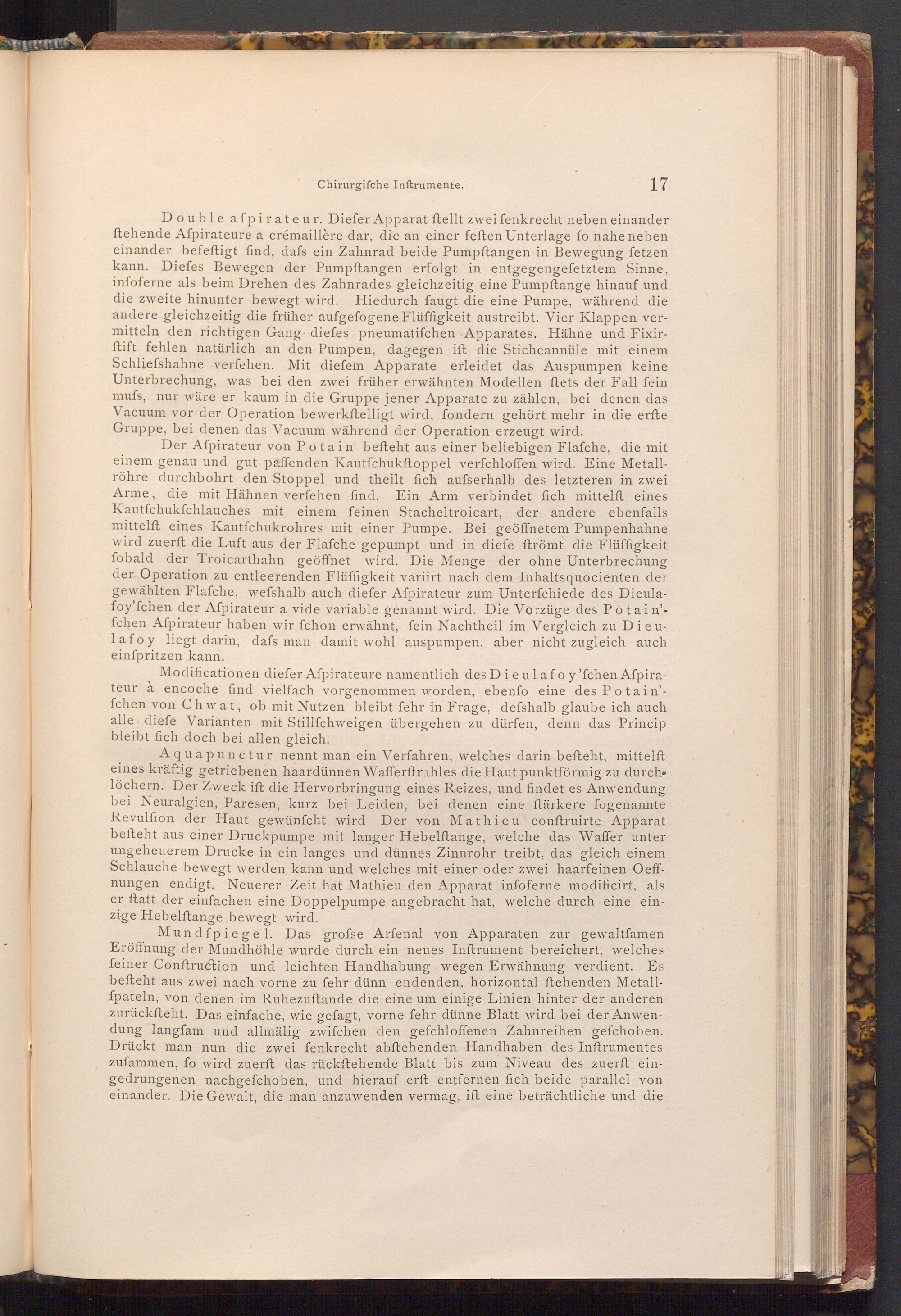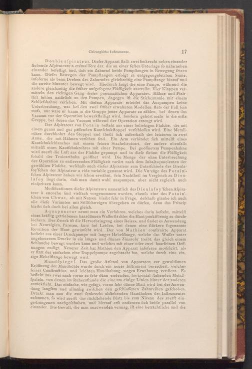 Modificationen diefer Afpirateure namentlich des Dieulafo y' fchen Afpirateur à encoche find vielfach vorgenommen worden, ebenfo eine des Potain'fchen von Chwat, ob mit Nutzen bleibt fehr in Frage, defshalb glaube ich auch alle diefe Varianten mit Stillfchweigen übergehen zu dürfen, denn das Princip bleibt fich doch bei allen gleich.