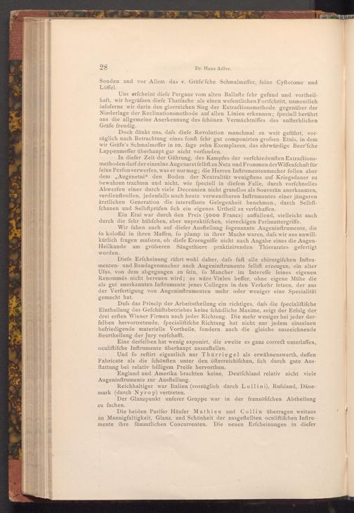 Uns erfcheint diefe Purganz vom alten Ballafte fehr gefund und vortheilhaft, wir begrüfsen diefe Thatfache als einen wefentlichen Fortfchritt, namentlich infoferne wir darin den glorreichen Sieg der Extractionsmethode gegenüber der Niederlage der Reclinationsmethode auf allen Linien erkennen; fpeciell berührt uns die allgemeine Anerkennung des fchönen Vermächtniffes des unfterblichen Gräfe freudig.