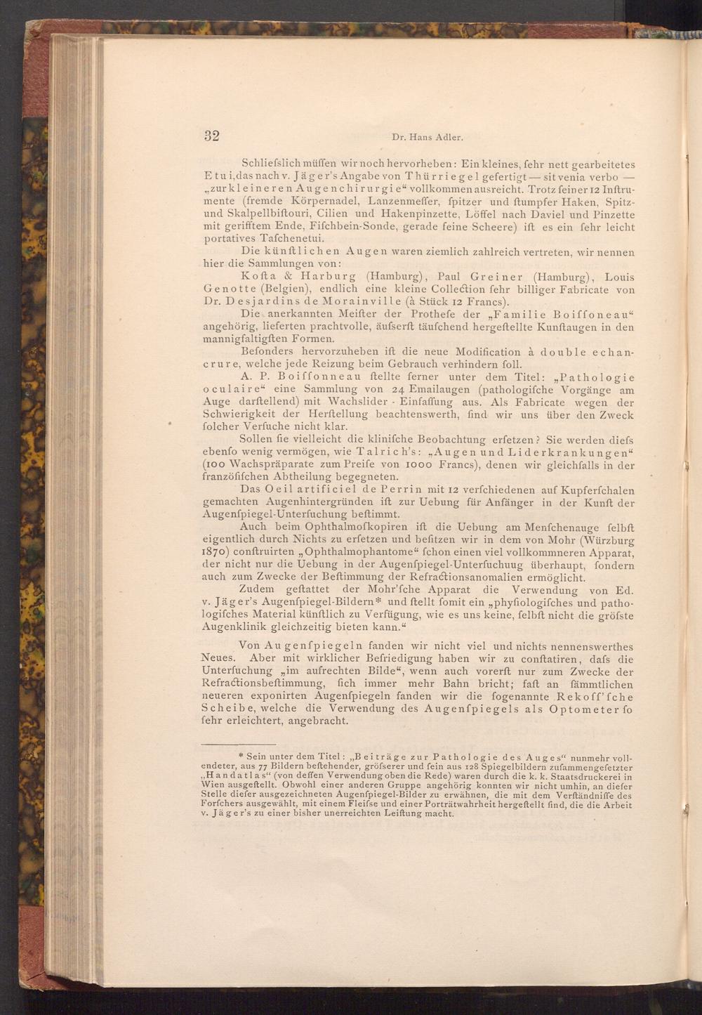 Zudem geftattet der Mohr'fche Apparat die Verwendung von Ed. v. Jäger's Augenfpiegel- Bildern und ftellt fomit ein„ phyfiologifches und pathologifches Material künftlich zu Verfügung, wie es uns keine, felbft nicht die gröfste Augenklinik gleichzeitig bieten kann."