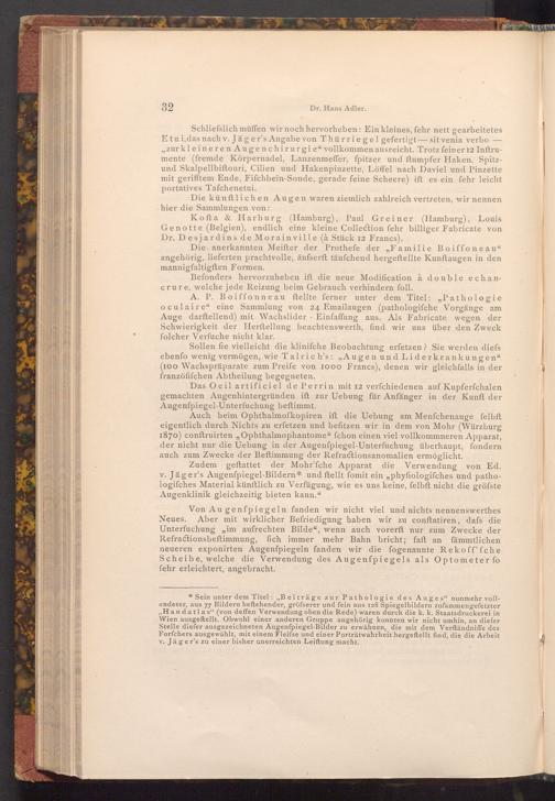 * Sein unter dem Titel: ,, Beiträge zur Pathologie des Auges" nunmehr vollendeter, aus 77 Bildern beftehender, gröfserer und fein aus 128 Spiegelbildern zufammengefetzter ,, Handatlas"( von deffen Verwendung oben die Rede) waren durch die k. k. Staatsdruckerei in Wien ausgeftellt. Obwohl einer anderen Gruppe angehörig konnten wir nicht umhin, an diefer Stelle diefer ausgezeichneten Augenfpiegel- Bilder zu erwähnen, die mit dem Verftändniffe des Forfchers ausgewählt, mit einem Fleifse und einer Porträtwahrheit hergestellt find, die die Arbeit v. Jäger's zu einer bisher unerreichten Leiftung macht.