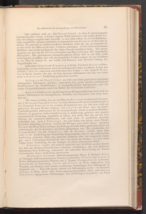 Wie fchon erwähnt, hat am reichften O efterreich in unferem Fache exponirt. J. Mang aus Prag und J. Sobel aus Graz ftellten wohl nur ältere Inftrumente in der bekannten Form und in nur wenigen Exemplaren aus; fie find aber recht gut gearbeitet. Es mufs Wunder nehmen, dafs J. Leiter aus Wien, dem das fchöne Verdienft gebührt, Inftrumente für die Laryngofkopie zuerft in grofsem Mafsftabe fabricirt, ja geradezu diefen Induftriezweig in Auffchwung gebracht und manche nennenswerthe Neuerung eingeführt zu haben, fich diefes Mal nur auf die Vorführung der bekannten Inftrumente, und auch nicht in reichlicher Auswahl, befchränkt hat. Auch J. Thürriegl, der eine Reihe von Jahren unter Türck's fpecieller Anleitung arbeitete, brachte nur Weniges und nichts Neues. Heinrich Reiner aus Wien ftellte in feiner Ausftellung zwei fehr fchön gearbeitete Etuis mit Inftrumenten, wie fie Schrötter und Störk gebrauchen, aus. Die„ Gefchichte der Laryngofkopie" von Dr. Schrötter und H. Reiner, welche ihren Platz beffer in der Ausftellung des Unterrichts- Departements oder in der additionellen Ausftellung gefunden hätte, aus manchen Gründen aber hier eingereiht wurde, gab einen vollständigen Ueberblick über den Stand des Faches, von den erften Tagen feiner Entftehung bis zur heutigen fo fchön entwickelten Höhe.