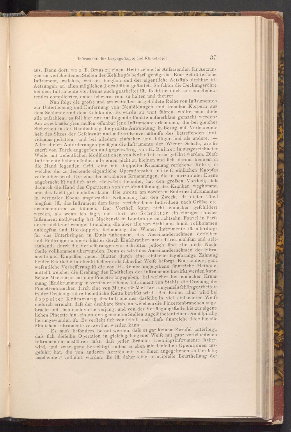 Nun folgt die grofse und am weiteften ausgebildete Reihe von Inftrumenten zur Unterfuchung und Entfernung von Neubildungen und fremden Körpern aus dem Schlunde und dem Kehlkopfe. Es würde zu weit führen, wollte man diefe alle aufzählen; es foll hier nur auf folgende Punkte aufmerkfam gemacht werden: Am zweckmäfsigften müffen offenbar jene Inftrumente erfcheinen, die bei gleicher Sicherheit in der Handhabung die gröfste Anwendung in Bezug auf Verfchiedenheit des Sitzes der Gefchwulft und auf Gröfsenverhältniffe des betreffenden Individuums geftatten, und bei alledem einfacher und billiger find als andere. Allen diefen Anforderungen genügen die Inftrumente der Wiener Schule, wie fie zuerft von Türck angegeben und gegenwärtig von H. Reiner in ausgezeichneter Weife, mit wefentlichen Modificationen von Schrötter ausgeführt werden. Diefe Inftrumente haben nämlich alle einen nicht zu kleinen und fich darum bequem in die Hand legenden Griff, eine mit doppelter Krümmung verfehene Röhre, in welcher der zu deckende eigentliche Operationstheil mittelft einfachen Knopfes verfchoben wird. Die eine der erwähnten Krümmungen, die in horizontaler Ebene angebracht ift und fich nach rückwärts befindet, hat den grofsen Vortheil, dafs dadurch die Hand des Operateurs von der Mundöffnung des Kranken wegkommt, und das Licht gut einfallen kann. Die zweite am vorderen Ende des Inftrumentes in verticaler Ebene angebrachte Krümmung hat den Zweck, da diefer Theil biegfam ift, das Inftrument dem Baue verfchiedener Individuen nach Gröfse etc. accommodiren zu können. Der Vortheil kann nicht einfacher gefchildert werden, als wenn ich fage, dafs dort, wo Schrötter ein einziges solches Inftrument nothwendig hat, Mackenzie in London deren achtzehn, Fauvel in Paris deren nicht viel weniger brauchen, die aber alle von Stahl und fomit vollkommen unbiegfam find. Die doppelte Krümmung der Wiener Inftrumente ift allerdings für das Unterbringen in Etuis unbequem, das Auseinandernehmen derfelben und Einbringen anderer Blätter durch Einfchrauben nach Türck mühfam und zeitraubend; durch die Verbefferungen von Schrötter jedoch find alle diefe Nachtheile vollkommen überwunden. Denn es wird das Auseinandernehmen der Inftrumente und Einpaffen neuer Blätter durch eine einfache fägeförmige Zähnung beider Endtheile in ebenfo ficherer als fchneller Weife beforgt. Eine andere, ganz wefentliche Verbefferung ift die von H. Reiner angegebene finnreiche Methode, mittelft welcher die Drehung des Endtheiles der Inftrumente bewirkt werden kann. Schon Mackenzie hat eine Pincette angegeben, bei welcher bei einfacher Krümmung( Endkrümmung in verticaler Ebene, Inftrument von Stahl) die Drehung der Pincettenbranchen durch eine von Mayer& Meltzer ungemein fchön gearbeitete in der Deckungsröhre befindliche Kette bewirkt wird. Bei Reiner aber wird bei doppelter Krümmung des Inftrumentes dasfelbe in viel einfacherer Weife dadurch erreicht, dafs der drehbare Stab, an welchem die Pincettenbranchen angebracht find, fich nach vorne verjüngt und von der Verjüngungsftelle bis zur eigentlichen Pincette hin, ein an den genannten Stellen angelötheter feiner Draht fpiralig herumgewunden ift. Es verfteht fich von felbft, dafs diefe finnreiche Idee für alle ähnlichen Inftrumente verwerthet werden kann.