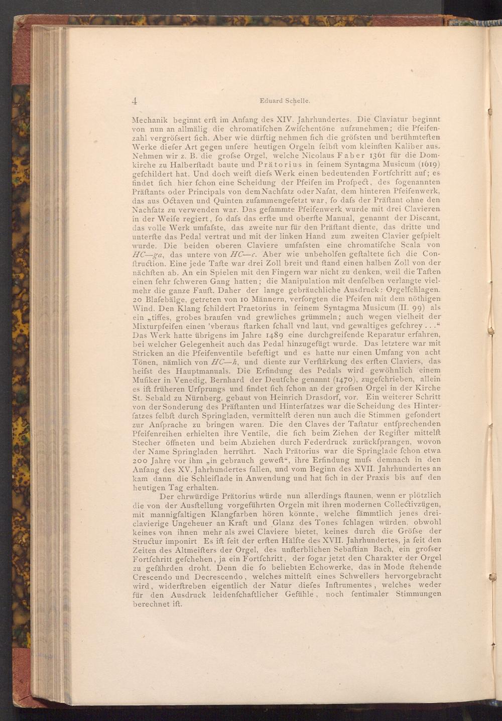 Mechanik beginnt erft im Anfang des XIV. Jahrhundertes. Die Claviatur beginnt von nun an allmälig die chromatifchen Zwifchentöne aufzunehmen; die Pfeifenzahl vergröfsert fich. Aber wie dürftig nehmen fich die gröfsten und berühmteften. Werke diefer Art gegen unfere heutigen Orgeln felbft vom kleinften Kaliber aus. Nehmen wir z. B. die grofse Orgel, welche Nicolaus Faber 1361 für die Domkirche zu Halberstadt baute und Prätorius in feinem Syntagma Musicum( 1619) gefchildert hat. Und doch weift diefs Werk einen bedeutenden Fortfchritt auf; es findet fich hier fchon eine Scheidung der Pfeifen im Profpect, des fogenannten Präftants oder Principals von dem Nachfatz oder Nafat, dem hinteren Pfeifenwerk, das aus Octaven und Quinten zufammengefetzt war, fo dafs der Präftant ohne den Nachfatz zu verwenden war. Das gefammte Pfeifenwerk wurde mit drei Clavieren in der Weife regiert, fo dafs das erfte und oberfte Manual, genannt der Discant, das volle Werk umfafste, das zweite nur für den Präftant diente, das dritte und unterfte das Pedal vertrat und mit der linken Hand zum zweiten Clavier gefpielt wurde. Die beiden oberen Claviere umfafsten eine chromatifche Scala von HC- ga, das untere von HC- c. Aber wie unbeholfen geftaltete fich die Conftruction. Eine jede Tafte war drei Zoll breit und ftand einen halben Zoll von der nächften ab. An ein Spielen mit den Fingern war nicht zu denken, weil die Taften einen fehr fchweren Gang hatten; die Manipulation mit denfelben verlangte vielmehr die ganze Fauft. Daher der lange gebräuchliche Ausdruck: Orgelfchlagen. 20 Blafebälge, getreten von 10 Männern, verforgten die Pfeifen mit dem nöthigen Wind. Den Klang fchildert Praetorius in feinem Syntagma Musicum( II. 99) als ein ,, tiffes, grobes braufen vnd grewliches grümmeln; auch wegen vielheit der Mixturpfeifen einen' vberaus ftarken fchall vnd laut, vnd gewaltiges gefchrey.. Das Werk hatte übrigens im Jahre 1489 eine durchgreifende Reparatur erfahren, bei welcher Gelegenheit auch das Pedal hinzugefügt wurde. Das letztere war mit Stricken an die Pfeifenventile befeftigt und es hatte nur einen Umfang von acht Tönen, nämlich von HC- h, und diente zur Verftärkung des erften Claviers, das heifst des Hauptmanuals. Die Erfindung des Pedals wird gewöhnlich einem Mufiker in Venedig, Bernhard der Deutfche genannt( 1470), zugefchrieben, allein es ift früheren Urfprungs und findet fich fchon an der grofsen Orgel in der Kirche St. Sebald zu Nürnberg, gebaut von Heinrich Drasdorf, vor. Ein weiterer Schritt von der Sonderung des Präftanten und Hinterfatzes war die Scheidung des Hinterfatzes felbft durch Springladen, vermittelft deren nun auch die Stimmen gefondert zur Anfprache zu bringen waren. Die den Claves der Taftatur entſprechenden Pfeifenreihen erhielten ihre Ventile, die fich beim Ziehen der Regifter mittelft Stecher öffneten und beim Abziehen durch Federdruck zurückfprangen, wovon der Name Springladen herrührt. Nach Prätorius war die Springlade fchon etwa 200 Jahre vor ihm, in gebrauch geweft", ihre Erfindung mufs demnach in den Anfang des XV. Jahrhundertes fallen, und vom Beginn des XVII. Jahrhundertes an kam dann die Schleiflade in Anwendung und hat fich in der Praxis bis auf den heutigen Tag erhalten.