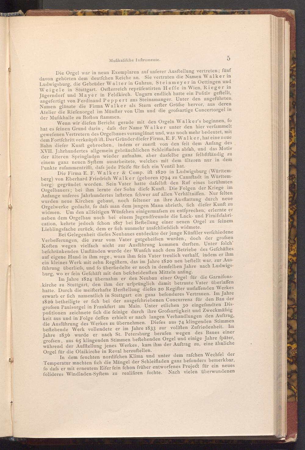 Die Firma E. F. Walker& Comp. ift 1820 in Ludwigsburg( Württemberg) von Eberhard Friedrich Walker( geboren 1794 zu Cannftadt in Württemberg) gegründet worden. Sein Vater hatte dafelbft den Ruf eines berühmten Orgelbauers; bei ihm lernte der Sohn diefe Kunft. Die Folgen der Kriege im Anfange unferes Jahrhundertes lafteten fchwer auf allen Verhältniffen. Nur felten wurden neue Kirchen gebaut, noch feltener an ihre Ausftattung durch neue Orgelwerke gedacht, fo dafs man dem jungen Mann abrieth, fich diefer Kunft zu widmen. Um den allfeitigen Wünſchen einigermassen zu entſprechen, erlernte er neben dem Orgelbau noch bei einem Jugendfreunde die Lack- und Firnifsfabrication, kehrte jedoch fchon 1817 bei Beftellung einer neuen Orgel zu feinem Lieblingsfache zurück, dem er fich nunmehr ausfchliefslich widmete.