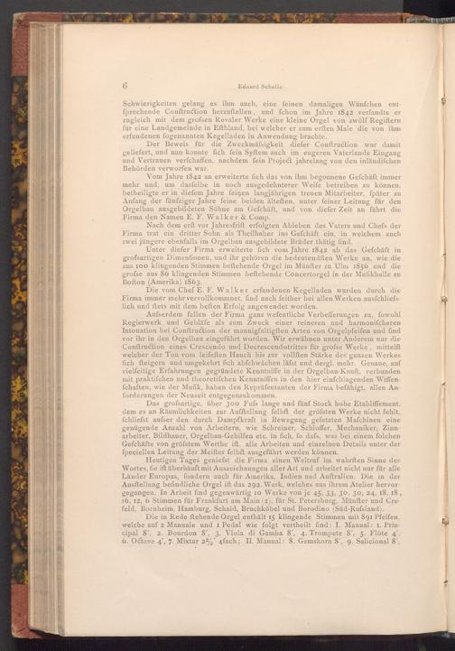 Vom Jahre 1842 an erweiterte fich das von ihm begonnene Gefchäft immer mehr und, um dasfelbe in noch ausgedehnterer Weife betreiben zu können, betheiligte er in diefem Jahre feinen langjährigen treuen Mitarbeiter, fpäter zu Anfang der fünfziger Jahre feine beiden älteften, unter feiner Leitung für den Orgelbau ausgebildeten Söhne am Gefchäft, und von diefer Zeit an führt die Firma den Namen E. F. Walker& Comp.