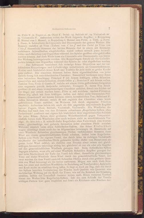 10. Flöte 8', II. Fugara 4', 12. Oboë 8'. Pedal: 13. Subbafs 16', 14. Violonbafs 16', 15. Violoncello 8'. Aufserdem befitzt das Werk folgende Regifter: 1. Koppelung II. Manual zum I. Manual, 2. Koppelung I. Manual zum Pedal, 3. Tutti, 4. Forte, 5. Piano, 6. Schwelltritt für Crescendo und Decrescendo des ganzen Werkes. Die Manuale umfaffen 56 Töne( Taften) von C bis und das Pedal 30 Töne von C bis f. Sämmtliche Stimmen der beiden Manuale find in einem mit Balancien verfehenen Schwellkaften eingefchloffen, welch' erftere mittelft jenes Schwelltrittes nach Belieben vom Organiften während des Spieles geöffnet oder gefchloffen werden können. Auf diefe Weife kann ein Crescendo oder Decrescendo von fchönfter Wirkung hervorgebracht werden. Die Koppelungen fowohl als die Collectivpedale können vom Organiften während des Spieles an- oder abgeftofsen werden. Das Inftrument bezeichnet fich vermöge feiner Dispofition und der verfchiedenen Koppelungen und Collectivzüge insbefondere als Concertinftrument, ift aber auch hinfichtlich feiner Kraft und Tonfülle für jede nicht zu grofse Kirche ganz paffend. Die einzelnen Stimmen haben ihren eigenthümlichen von jeder andern ftreng fich unterfcheidenden Charakter. Namentlich verdienen unter ihnen eine befondere Beachtung: Principal 8' mit feinem kräftigen, edlen, füllenden, glanzvollen und runden Grundton, ebenfo Octav 4'; Bourdon 8' mit feinem vollen, dunklen Ton; Viola di Gamba 8', welche mit einem fchön geftrichenen Geigenton eine ungemein präcife Anfprache verbindet; Trompete 8', deren Ton durchgreifend ift und einen trompetenartigen Charakter entfaltet, foweit ein folcher auf der Orgel nur erzielt werden kann; Flöte 4', mit weichem, rundem Flötenton, Mixtur 22 4fach mit ihrer kräftigen, hellen und dabei nicht fchreienden Füllftimme; Gemshorn 8' mit feinem fchönen, reinen, hornähnlichen Ton; Salicional 8', deffen Intonation überaus weich ift und zugleich den Charakter eines leicht geftrichenen Tones entfaltet, im Weiteren fich durch ungemeine Präcifion empfiehlt. Ausserdem heben wir noch als fehr angenehm anfprechende Regifter hervor: Fugara, Oboë, Subbafs, Violonbafs, Violoncello. Die Windladen des Werkes find nach dem von den Erbauern erfundenen ,, Kegelladen Syftem ohne Federdruck" conftruirt und eignen fich hinfichtlich ihrer ungewöhnlichen Solidität für jedes Klima. Neben ihrer gröfseren Widerftandskraft gegen Temperatureinflüffe haben diefe Windladen aber noch weitere nicht zu unterfchätzende Vorzüge. So läfst fich z. B. mittelft diefer Kegelladen ohne Federdruck eine überaus reine, gleichmäfsige und gefunde Intonation jeder einzelnen Pfeife erzielen. Während nämlich beim alten Schleifladen- Syftem, das feiner Einfachheit wegen allerdings heute noch das im Allgemeinen bevorzugte ift, fämmtliche auf einer Windlade ftehenden gleichnamigen Pfeifen verfchiedener Stimmen ihren Wind aus einem gemeinfchaftlichen Ventil erhalten, befitzt beim KegelladenSyftem jede Pfeife ihr eigenes Ventil, das durch feine im richtigen Verhältniffe zur Menfur der betreffenden Pfeife gebrachte Gröfse diefer vom Hauptcanal aus genau foviel Wind zuführt, als diefelbe zum Zwecke einer reinen und gleichmäfsigen Intonation unbedingt nöthig hat, gleichviel ob nur ein oder alle Regifter Beim Schleifladen- Syftem auf der gemeinfchaftlichen Windlade gezogen find. dagegen erhalten, wenn alle auf einer Windlade ftehenden Regifter gezogen find und beim Niederdruck der Tafte das Ventil fich öffnet, fämmtliche gleichnamigen Töne auf diefer Windlade ihren Wind durch das gemeinfchaftliche Ventil, und zwar werden die dem Ventil zunächft ftehenden Pfeifen durch eine gröfsere Quantität von Wind bevorzugt als die weiter entfernten. Mögen nun auch diefe Stimmen bei einer und derfelben Windftärke in Beziehung auf Toncharakter, Anſprache und Kraft nichts zu wünfchen übrig laffen, fo liegt es doch am Tag, dafs die durch das Syftem bewirkte Veränderung des Windes nach Qualität wie Quantität eine nachtheilige Wirkung auf die Kraft des Tones, wie auf die Reinheit der Stimmung ausüben, mithin der Totaleffect darunter leiden mufs. Einen weiteren Vortheil bietet das Walker'fche Kegelladen- Syftem, dafs die zum Schluffe der Ventile nöthigen Federn hier ganz wegfallen und fomit ein Erlahmen oder Brechen der