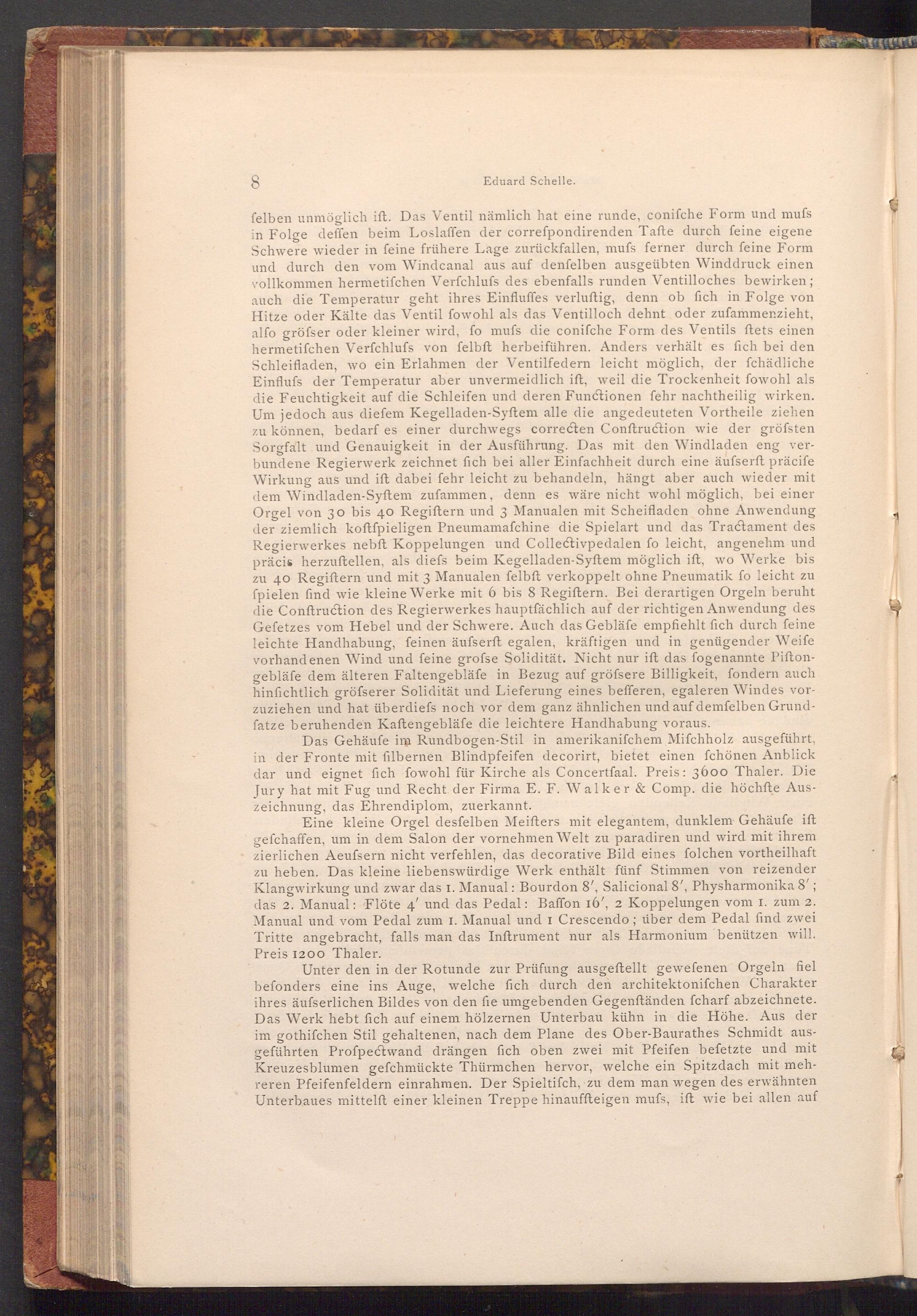 Das Gehäufe im Rundbogen- Stil in amerikaniſchem Mifchholz ausgeführt, in der Fronte mit filbernen Blindpfeifen decorirt, bietet einen fchönen Anblick dar und eignet fich fowohl für Kirche als Concertfaal. Preis: 3600 Thaler. Die Jury hat mit Fug und Recht der Firma E. F. Walker& Comp. die höchfte Auszeichnung, das Ehrendiplom, zuerkannt.