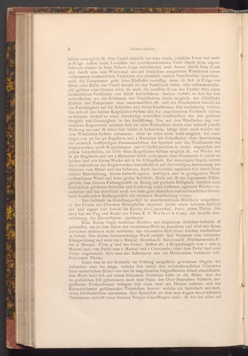 Eine kleine Orgel desfelben Meifters mit elegantem, dunklem Gehäufe ift gefchaffen, um in dem Salon der vornehmen Welt zu paradiren und wird mit ihrem zierlichen Aeufsern nicht verfehlen, das decorative Bild eines folchen vortheilhaft zu heben. Das kleine liebenswürdige Werk enthält fünf Stimmen von reizender Klangwirkung und zwar das I. Manual: Bourdon 8', Salicional 8', Physharmonika 8'; das 2. Manual: Flöte 4' und das Pedal: Baffon 16', 2 Koppelungen vom I. zum 2. Manual und vom Pedal zum 1. Manual und 1 Crescendo; über dem Pedal find zwei Tritte angebracht, falls man das Inftrument nur als Harmonium benützen will. Preis 1200 Thaler.