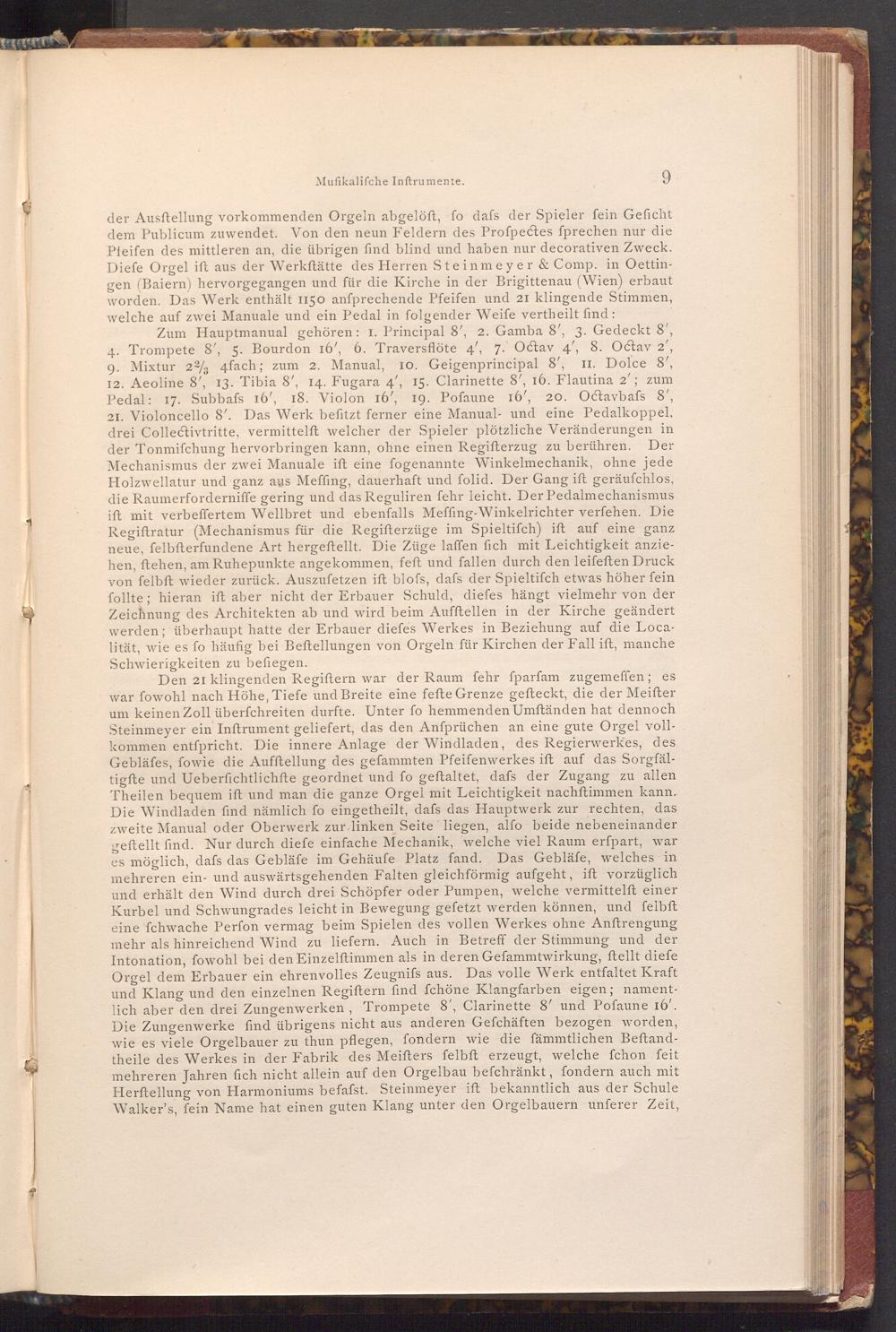 der Ausftellung vorkommenden Orgeln abgelöft, fo dafs der Spieler fein Geficht dem Publicum zuwendet. Von den neun Feldern des Profpectes fprechen nur die Pfeifen des mittleren an, die übrigen find blind und haben nur decorativen Zweck. Diefe Orgel ift aus der Werkftätte des Herren Steinmeyer& Comp. in Oettingen( Baiern) hervorgegangen und für die Kirche in der Brigittenau( Wien) erbaut worden. Das Werk enthält 1150 anfprechende Pfeifen und 21 klingende Stimmen, welche auf zwei Manuale und ein Pedal in folgender Weife vertheilt find: