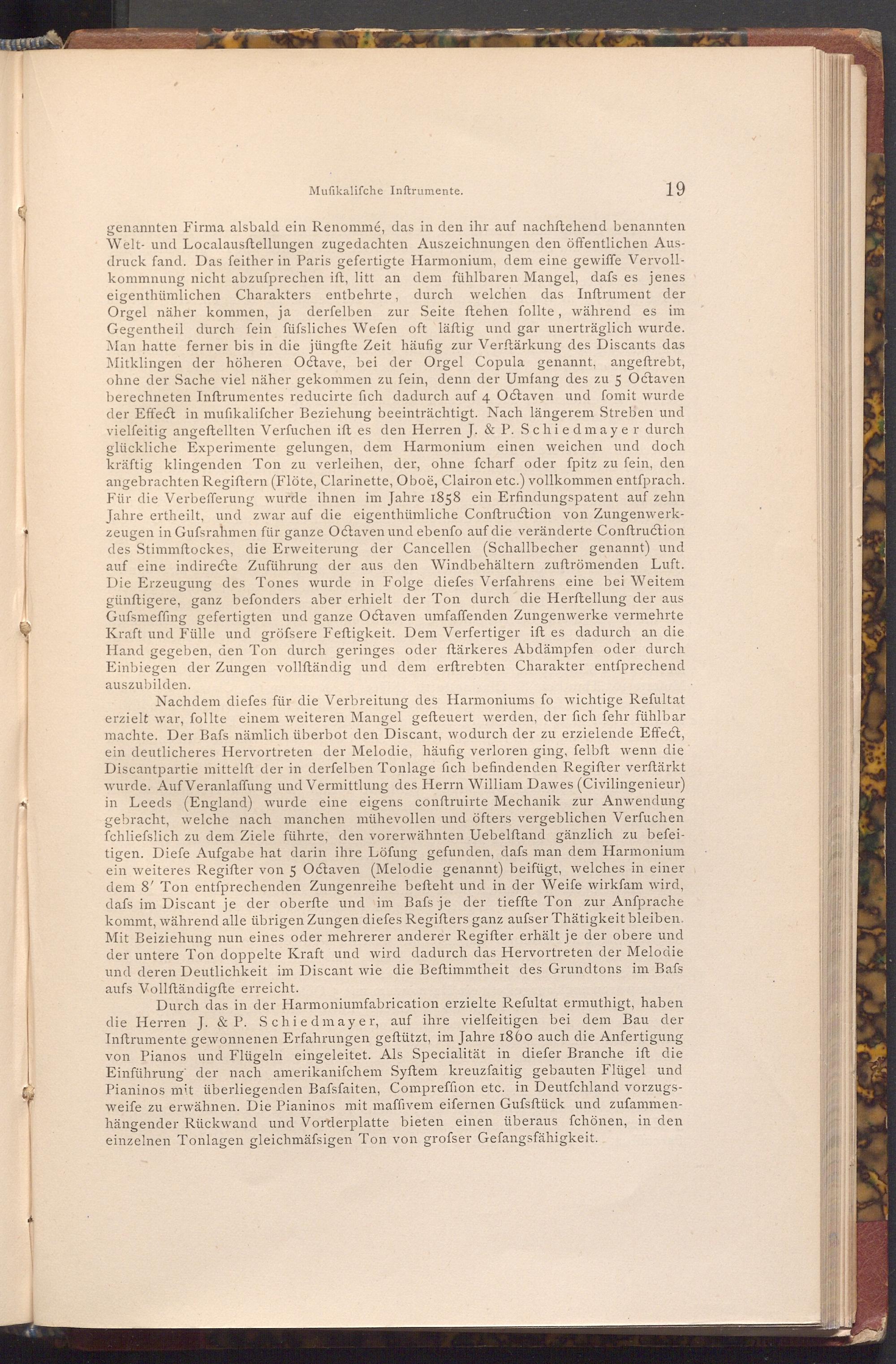 genannten Firma alsbald ein Renommé, das in den ihr auf nachftehend benannten Welt- und Localausftellungen zugedachten Auszeichnungen den öffentlichen Ausdruck fand. Das feither in Paris gefertigte Harmonium, dem eine gewiffe Vervollkommnung nicht abzufprechen ift, litt an dem fühlbaren Mangel, dafs es jenes eigenthümlichen Charakters entbehrte, durch welchen das Inftrument der Orgel näher kommen, ja derfelben zur Seite ftehen follte, während es im Gegentheil durch fein füfsliches Wefen oft läftig und gar unerträglich wurde. Man hatte ferner bis in die jüngfte Zeit häufig zur Verftärkung des Discants das Mitklingen der höheren Octave, bei der Orgel Copula genannt, angeftrebt, ohne der Sache viel näher gekommen zu fein, denn der Umfang des zu 5 Octaven berechneten Inftrumentes reducirte fich dadurch auf 4 Octaven und fomit wurde der Effect in mufikalifcher Beziehung beeinträchtigt. Nach längerem Streben und vielfeitig angeftellten Verfuchen ift es den Herren J.& P. Schiedmayer durch glückliche Experimente gelungen, dem Harmonium einen weichen und doch kräftig klingenden Ton zu verleihen, der, ohne fcharf oder fpitz zu fein, den angebrachten Regiftern( Flöte, Clarinette, Oboë, Clairon etc.) vollkommen entſprach. Für die Verbefferung wurde ihnen im Jahre 1858 ein Erfindungspatent auf zehn Jahre ertheilt, und zwar auf die eigenthümliche Conftruction von Zungenwerkzeugen in Gufsrahmen für ganze Octaven und ebenfo auf die veränderte Conftruction des Stimmftockes, die Erweiterung der Cancellen( Schallbecher genannt) und auf eine indirecte Zuführung der aus den Windbehältern zuftrömenden Luft. Die Erzeugung des Tones wurde in Folge diefes Verfahrens eine bei Weitem günftigere, ganz befonders aber erhielt der Ton durch die Herftellung der aus Gufsmeffing gefertigten und ganze Octaven umfaffenden Zungenwerke vermehrte Kraft und Fülle und gröfsere Feftigkeit. Dem Verfertiger ift es dadurch an die Hand gegeben, den Ton durch geringes oder ftärkeres Abdämpfen oder durch Einbiegen der Zungen vollſtändig und dem erftrebten Charakter entſprechend auszubilden.