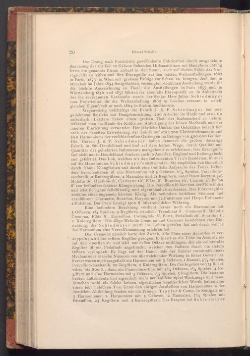 Gegenwärtig befchäftigt die Fabrik J.& P. Schiedmayer bei gedehntem Betriebe mit Dampfeinrichtung 200 Arbeiter im Haufe und etwa 60 aufserhalb. Letztere haben einen grofsen Theil der Kaftenarbeit zu liefern, während man im Haufe die Kräfte zur Anfertigung der feinen Mechanik und der inneren Einrichtung verwendet. Der jährliche Umfatz des Gefchäftes beläuft fich nach der neueften Erweiterung der Fabrik auf etwa 700 Clavierinftrumente und 800 Harmoniums der verfchiedenften Gattungen im Betrage von 400.000 Gulden. Die Herren J.& P. Schiedmayer haben demnach die gröfste derartige Fabrik in Süd- Deutfchland und find auf dem beften Wege, durch Qualität und Quantität der gelieferten Inftrumente mafsgebend zu erfcheinen; ihre Erzeugniffe find nicht nur in Deutſchland, fondern auch in Amerika, England und Italien gefucht und gefchätzt. Das Lob, welches wir den Inftrumenten Titz's fpendeten, ift auch auf die Harmoniums Schiedmayer's anzuwenden. Sie empfehlen fich fämmtlich durch fchöne Klangfarben und durch eine treffliche Anfprache des Tones. Befonders hervorzuheben ift ein Harmonium mit 5 Octaven, 6% Spielen, Percuffionsmechanik, 2 Knieregiftern, 2 Manualen und 21 Regiftern, unter ihnen Baryton 32', Mufette 16', Hautbois 8', Clarinette 16', Flûte 8', Bourdon 16', Clairon 4', Baffon 8' von befonders fchöner Klangwirkung. Die Percuffion ift hier von der Flöte ifolirt und läfst fich ganz felbftftändig und eigenthümlich ausbeuten. Das Flötenregifter entfaltet einen ungemein fchönen Klang. Als befonders wirkfame Stimmen find anzuführen: Clarinette, Bourdon, Baryton mit 32- Fufstönen und Harpe- Eolienene 2- Fufstöne. Der Preis beträgt 1500 fl öfterreichifcher Währung.