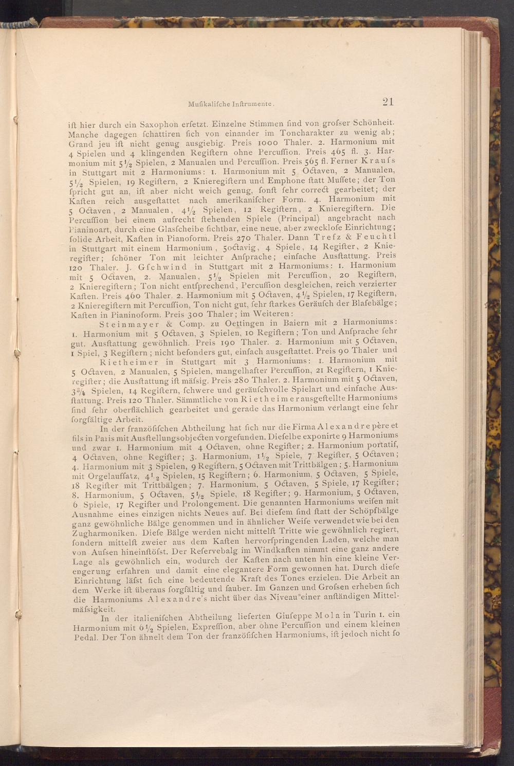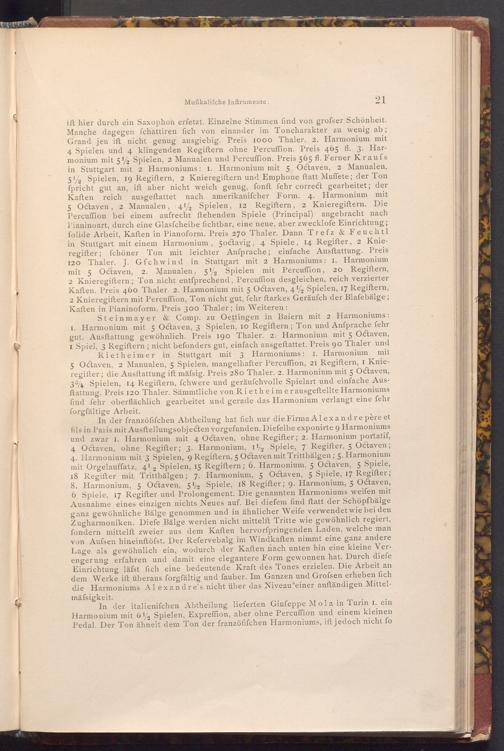 Steinmayer& Comp. zu Oettingen in Baiern mit 2 Harmoniums: 1. Harmonium mit 5 Octaven, 3 Spielen, 10 Regiftern; Ton und Anfprache fehr gut. Ausftattung gewöhnlich. Preis 190 Thaler. 2. Harmonium mit 5 Octaven, I Spiel, 3 Regiftern; nicht befonders gut, einfach ausgeftattet. Preis 90 Thaler und Rietheimer in Stuttgart mit 3 Harmoniums: 3 Harmoniums: 1. Harmonium mit 5 Octaven, 2 Manualen, 5 Spielen, mangelhafter Percuffion, 21 Regiftern, I Knieregifter; die Ausftattung ift mäfsig. Preis 280 Thaler. 2. Harmonium mit 5 Octaven, 34 Spielen, 14 Regiftern, fchwere und geräuschvolle Spielart und einfache Ausftattung. Preis 120 Thaler. Sämmtliche von Rietheimer ausgeftellte Harmoniums find fehr oberflächlich gearbeitet und gerade das Harmonium verlangt eine fehr forgfältige Arbeit.