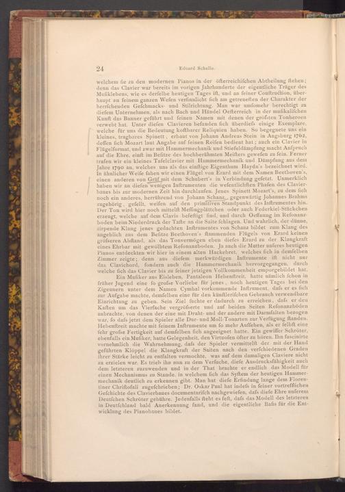welchem fie zu den modernen Pianos in der öfterreichifchen Abtheilung ftehen; denn das Clavier war bereits im vorigen Jahrhunderte der eigentliche Träger des Mufiklebens, wie es derfelbe heutigen Tages ift, und an feiner Conftruction, überhaupt an feinem ganzen Wefen verfinnlicht fich am getreueften der Charakter der herrfchenden Gefchmacks- und Stilrichtung. Man war umfomehr berechtigt zu diefem Unternehmen, als nach Bach und Händel Oefterreich in der mufikalifchen Kunft das Banner geführt und feinen Namen mit denen der gröfsten Tonheroen verwebt hat. Unter diefen Clavieren befanden fich überdiefs einige Exemplare, welche für uns die Bedeutung koftbarer Reliquien haben. So begegnete uns ein kleines, tragbares Spinett, erbaut von Johann Andreas Stein in Augsburg 1762, deffen fich Mozart laut Angabe auf feinen Reifen bedient hat; auch ein Clavier in Flügelformat, und zwar mit Hammermechanik und Stiefeldämpfung macht Anspruch auf die Ehre, einft im Befitze des hochberühmten Meifters gewefen zu fein. Ferner trafen wir ein kleines Tafelclavier mit Hammermechanik und Dämpfung aus dem Jahre 1790 an, welches uns als das einftige Eigenthum Haydn's bezeichnet wird. In ähnlicher Weife fahen wir einen Flügel von Erard mit dem Namen Beethoven's, einen anderen von Gräf mit dem Schubert's in Verbindung gefetzt. Unmerklich haben wir an diefen wenigen Inftrumenten die wefentlichften Phafen des Clavierbaues bis zur modernen Zeit hin durchlaufen. Jenes Spinett Mozart's, zu dem fich noch ein anderes, herrührend von Johann Schanz, gegenwärtig Johannes Brahms zugehörig, gefellt, weifen auf den primitiven Standpunkt des Inftrumentes hin. Der Ton wird hier noch mittelft Meffingplättchen oder auch Federkiel- Stückchen erzeugt, welche auf dem Clavis befeftigt find, und durch Oeffnung im Refonanzboden beim Niederdruck der Tafte an die Saite fchlagen. Und wahrlich, der dünne, zirpende Klang jenes gedachten Inftrumentes von Schanz bildet zum Klang des angeblich aus dem Befitze Beethoven's ftammenden Flügels von Erard keinen gröfseren Abftand, als das Tonvermögen eben diefes Erard zu der Klangkraft eines Ehrbar mit gewölbtem Refonanzboden. Ja auch die Mutter unferes heutigen Pianos entdeckten wir hier in einem alten Hackebret, welches fich in demfelben Zimmer zeigte; denn aus diefem merkwürdigen Inftrumente ift nicht nur das. Clavichord, fondern auch die Hammermechanik hervorgegangen, durch welche fich das Clavier bis zu feiner jetzigen Vollkommenheit emporgebildet hat. Ein Mufiker aus Eisleben, Pantaleon Hebenftreit, hatte nämlich fchon in früher Jugend eine fo grofse Vorliebe für jenes, noch heutigen Tages bei den Zigeunern unter dem Namen Cymbal vorkommende Inftrument, dafs er es fich zur Aufgabe machte, demfelben eine für den künftlerifchen Gebrauch verwendbare Einrichtung zu geben. Sein Ziel fuchte er dadurch zu erreichen, dafs er den Kaften um das Vierfache vergröfserte und auf beiden Seiten Refonanzböden anbrachte, von denen der eine mit Draht- und der andere mit Darmfaiten bezogen. war, fo dafs jetzt dem Spieler alle Dur- und Moll- Tonarten zur Verfügung ftanden. Hebenftreit machte mit feinem Inftrumente um fo mehr Auffehen, als er felbft eine fehr grofse Fertigkeit auf demfelben fich angeeignet hatte. Ein gewiffer Schröter, ebenfalls ein Mufiker, hatte Gelegenheit, den Virtuofen öfter zu hören. Ihn fascinirte vornehmlich die Wahrnehmung, dafs der Spieler vermittelft der mit der Hand geführten Klöppel die Klangkraft der Saiten nach den verfchiedenen Graden ihrer Stärke leicht zu entfalten vermochte, was auf dem damaligen Claviere nicht zu erzielen war. Es trieb ihn nun zu dem Verfuche, diefe Ausdrucksfähigkeit auch dem letzteren zuzuwenden und in der That brachte er endlich das Modell für einen Mechanismus zu Stande. in welchem fich das Syftem der heutigen Hammermechanik deutlich zu erkennen gibt. Man hat diefe Erfindung lange dem Florentiner Chriftofali zugefchrieben; Dr. Oskar Paul hat indefs in feiner vortrefflichen Gefchichte des Clavierbaues documentarifch nachgewiefen, dafs diefe Ehre unferem Deutſchen Schröter gebühre. Jedenfalls fteht es feft, dafs das Modell des letzteren in Deutfchland bald Anerkennung fand, und die eigentliche Bafis für die Entwicklung des Pianobaues bildet.