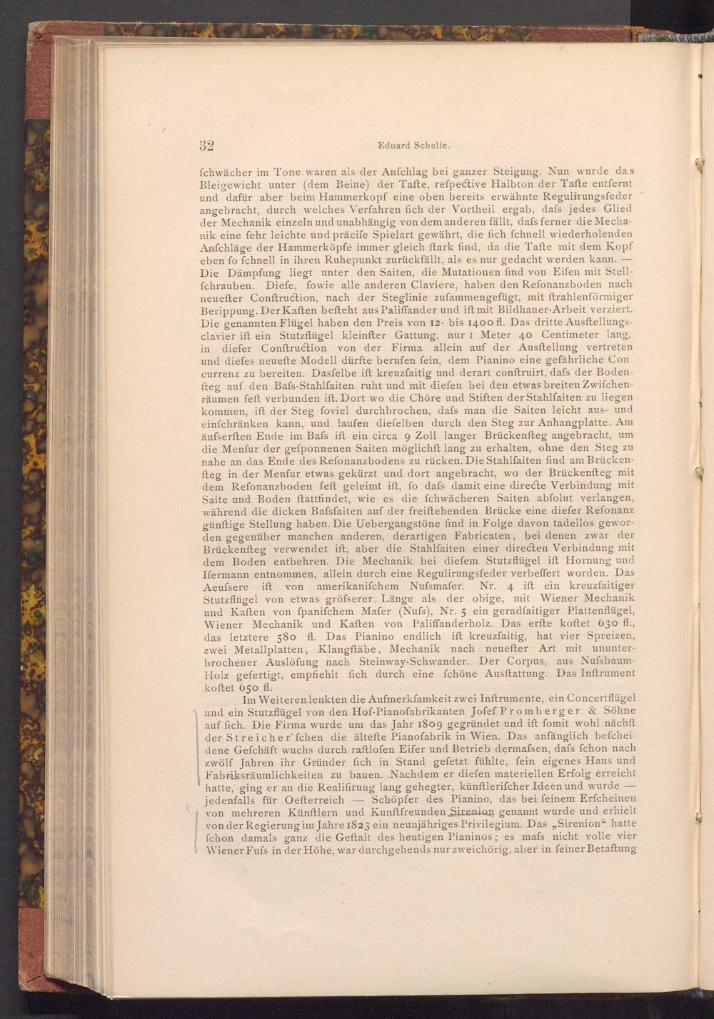 Im Weiteren lenkten die Aufmerkfamkeit zwei Inftrumente, ein Concertflügel und ein Stutzflügel von den Hof- Pianofabrikanten Jofef Promberger& Söhne auf fich. Die Firma wurde um das Jahr 1809 gegründet und ift fomit wohl nächft der Streicher' fchen die ältefte Pianofabrik in Wien. Das anfänglich befcheidene Gefchäft wuchs durch raftlofen Eifer und Betrieb dermafsen, dafs fchon nach zwölf Jahren ihr Gründer fich in Stand gefetzt fühlte, fein eigenes Haus und Fabriksräumlichkeiten zu bauen. Nachdem er diefen materiellen Erfolg erreicht hatte, ging er an die Realifirung lang gehegter, künftlerifcher Ideen und wurde jedenfalls für Oefterreich- Schöpfer des Pianino, das bei feinem Erfcheinen von mehreren Künftlern und Kunftfreunden Sirenion genannt wurde und erhielt von der Regierung im Jahre 1823 ein neunjähriges Privilegium. Das„ Sirenion" hatte fchon damals ganz die Geftalt des heutigen Pianinos; es mafs nicht volle vier Wiener Fufs in der Höhe, war durchgehends nur zweichörig, aber in feiner Betaftung