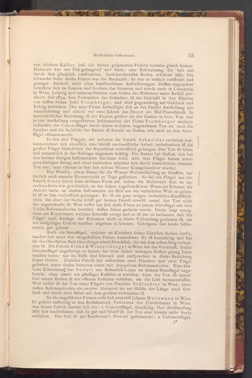 An die angeführten Firmen reiht fich zunächft Johann Heitzmann in Wien. Er gehört unftreitig zu den ftrebfameren Vertretern des Clavierbaues in Wien. Aus feiner Fabrik fanden fich vor: 1. Concertflügel, überfaitig. Der Abdämpfung läfst fich nachrühmen, dafs fie gut und fcharf ift, der Ton aber könnte mehr Seele entfalten. Das Pult ift mit Beethoven's Portrait gefchmückt; 2. Cabinetsflügel,