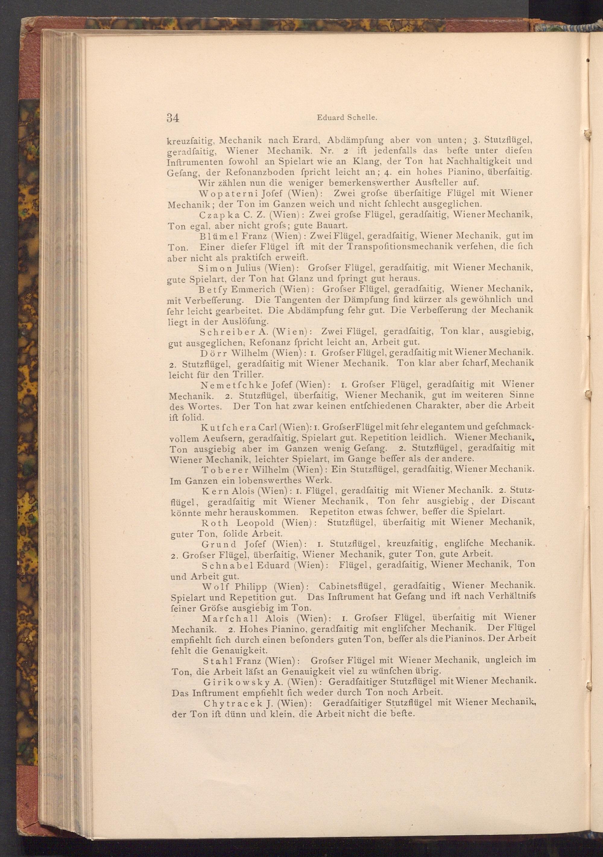 Grund Jofef( Wien): 1. Stutzflügel, kreuzfaitig, englifche Mechanik. 2. Grofser Flügel, überfaitig, Wiener Mechanik, guter Ton, gute Arbeit. Schnabel Eduard( Wien): Flügel, geradfaitig, Wiener Mechanik, Ton und Arbeit gut.