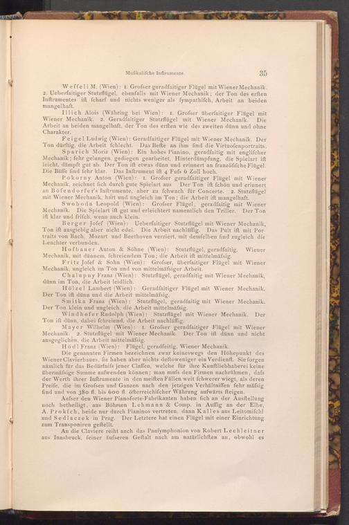 Swoboda Leopold( Wien): Grofser Flügel, geradfaitig mit Wiener Mechanik. Die Spielart ift gut und erleichtert namentlich den Triller. Der Ton ift klar und frifch, wenn auch klein.