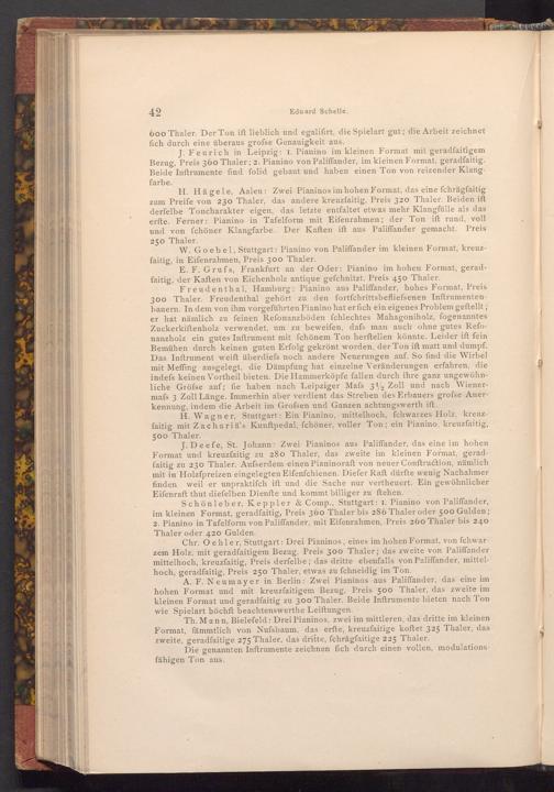 Chr. Oehler, Stuttgart: Drei Pianinos, eines im hohen Format, von fchwar zem Holz, mit geradfaitigem Bezug, Preis 300 Thaler; das zweite von Paliffander mittelhoch, kreuzfaitig, Preis derfelbe; das dritte ebenfalls von Paliffander, mittelhoch, geradfaitig, Preis 250 Thaler, etwas zu fchneidig im Ton.