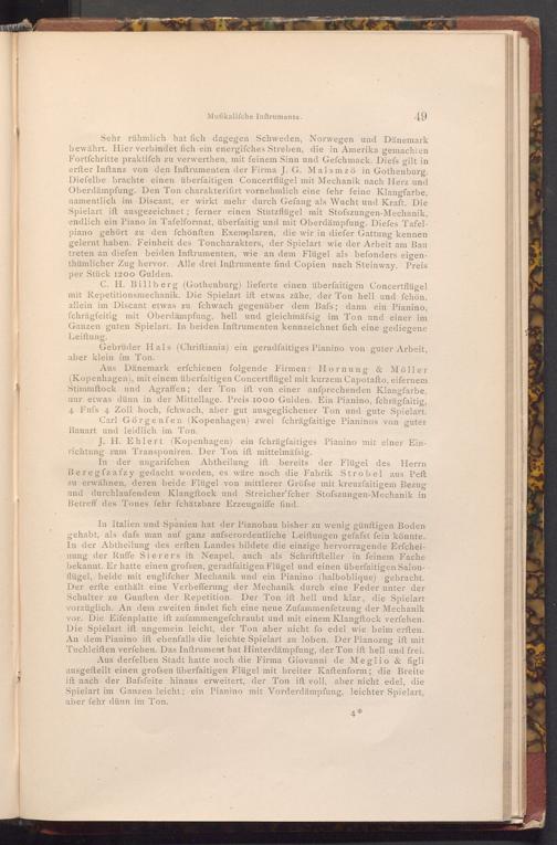Sehr rühmlich hat fich dagegen Schweden, Norwegen und Dänemark bewährt. Hier verbindet fich ein energifches Streben, die in Amerika gemachten Fortfchritte praktiſch zu verwerthen, mit feinem Sinn und Gefchmack. Diefs gilt in erfter Inftanz von den Inftrumenten der Firma J. G. Malsmzö in Gothenburg. Diefelbe brachte einen überfaitigen Concertflügel mit Mechanik nach Herz und Oberdämpfung. Den Ton charakterifirt vornehmlich eine fehr feine Klangfarbe, namentlich im Discant, er wirkt mehr durch Gefang als Wucht und Kraft. Die Spielart ift ausgezeichnet; ferner einen Stutzflügel mit Stofszungen- Mechanik, endlich ein Piano in Tafelformat, überfaitig und mit Oberdämpfung. Diefes Tafelpiano gehört zu den fchönften Exemplaren, die wir in diefer Gattung kennen gelernt haben. Feinheit des Toncharakters, der Spielart wie der Arbeit am Bau treten an diefen beiden Inftrumenten, wie an dem Flügel als befonders eigenthümlicher Zug hervor. Alle drei Inftrumente find Copien nach Steinway. Preis per Stück 1200 Gulden.